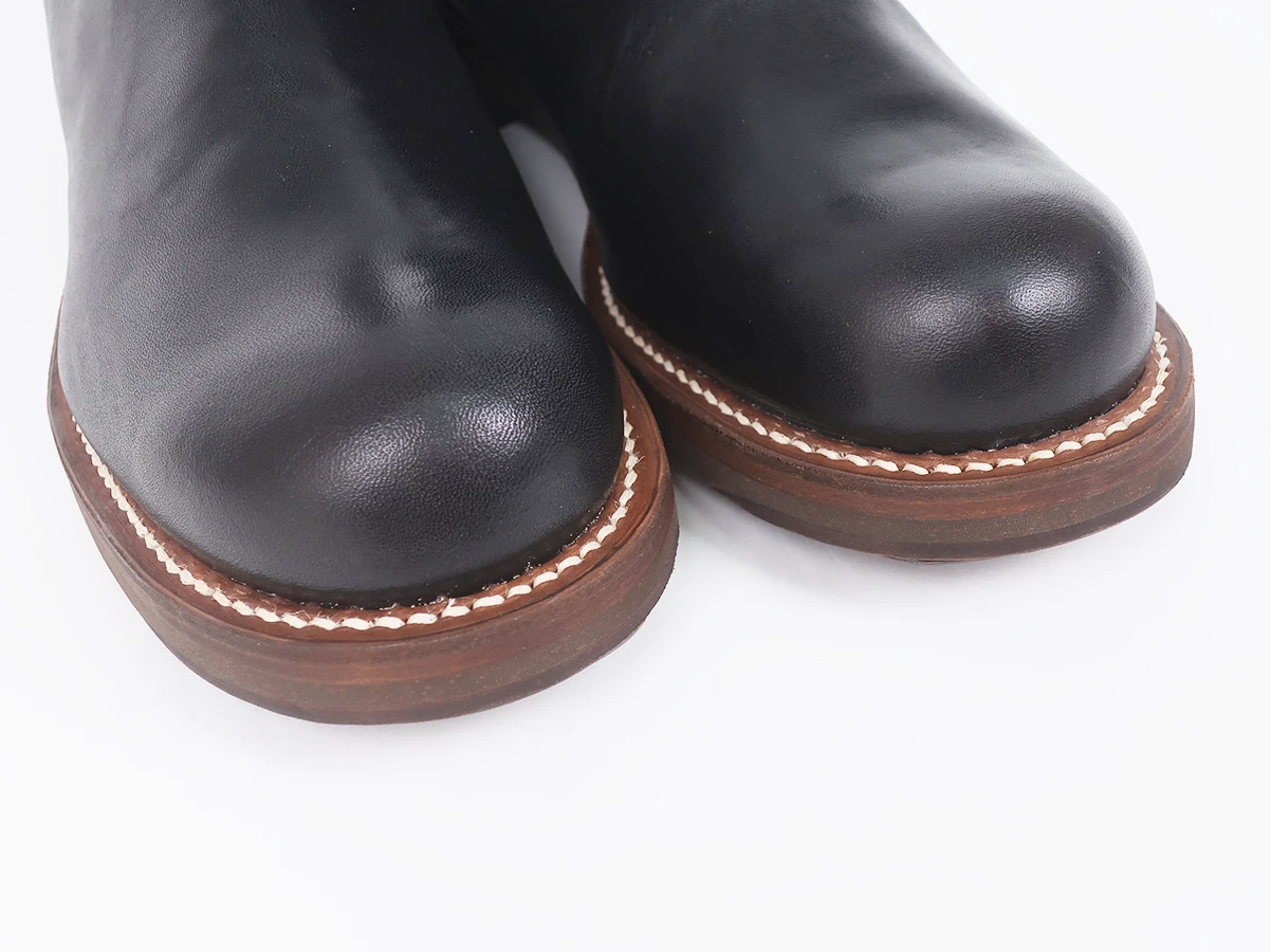 平らな一枚の革をここまで立体的なブーツの形にするのは熟練の職人による高度な技術の賜物です。縫い合わせのない分、また甲が弓なりに立ち上げられている分、履くことで生じるシワが際立ち、他では得られない印象深いエイジングが楽しめます。