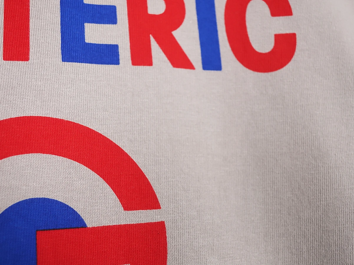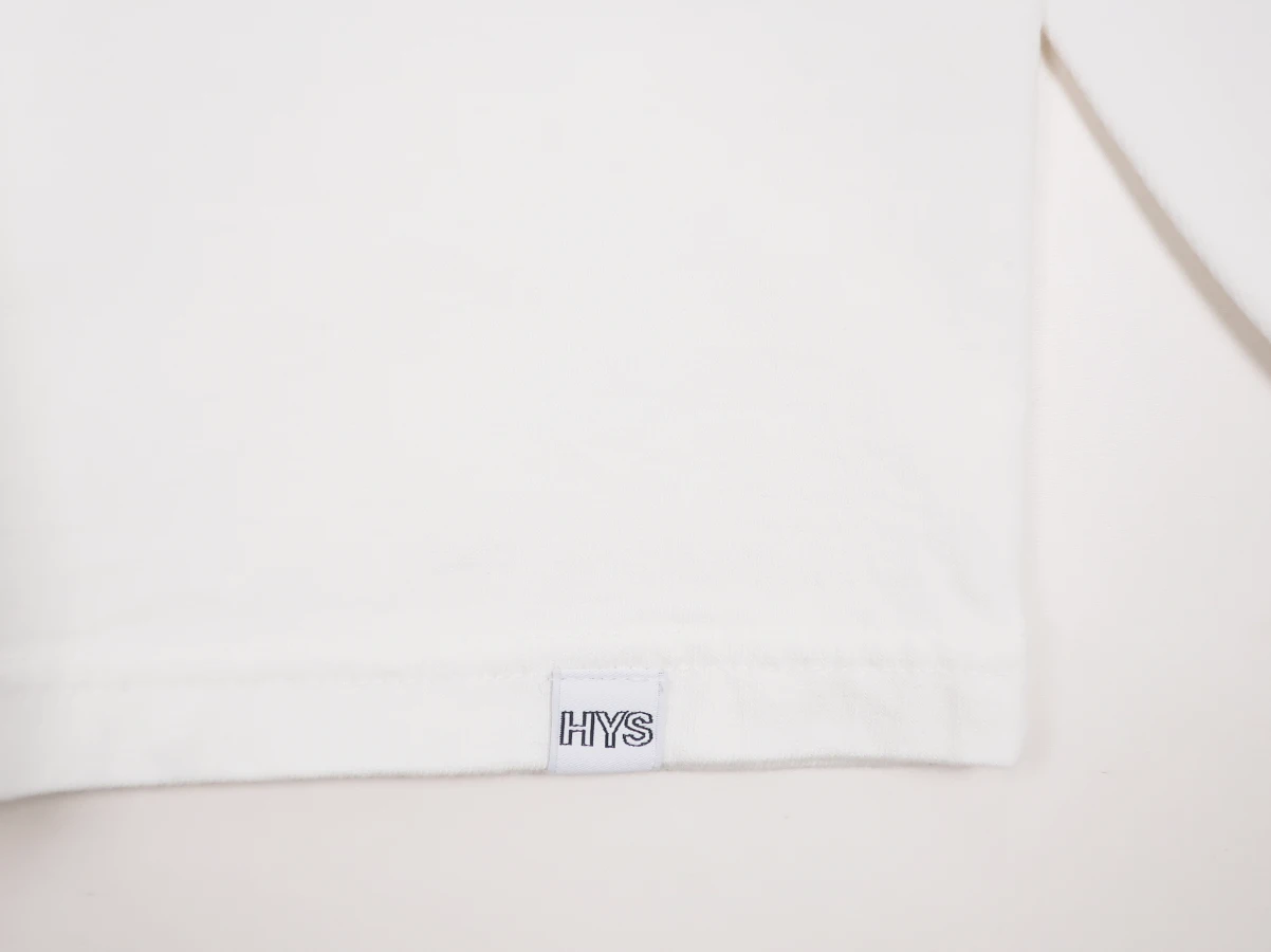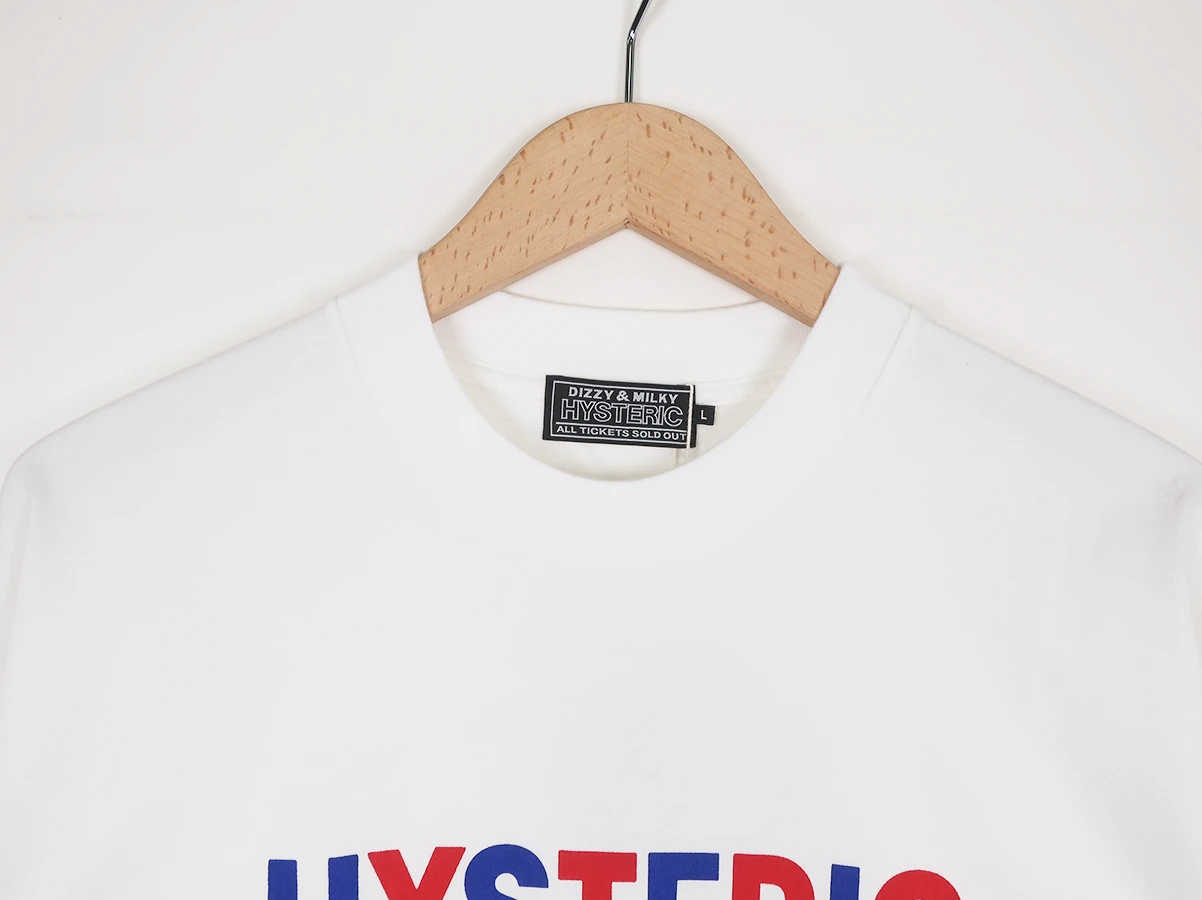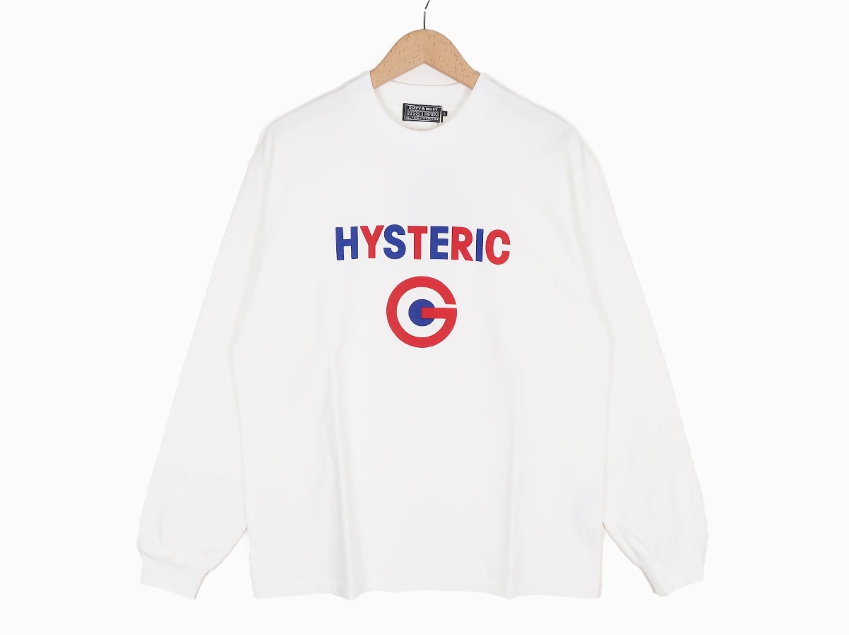シンプルなシルエットのモックネックTシャツ。フロントには、50年代後半頃の音楽やファッションの象徴ともされる配色とマークをHYSTERICクラシック風に落とし込んだデザイン。