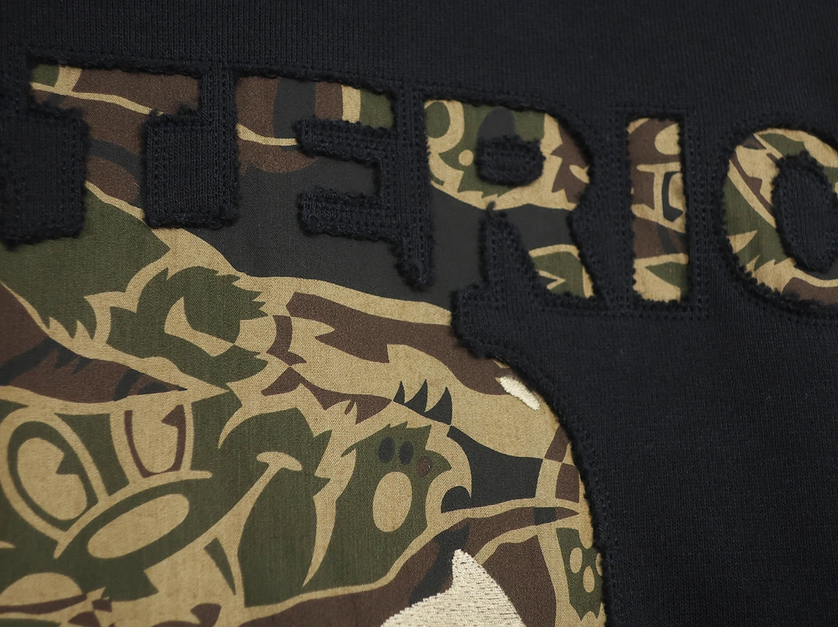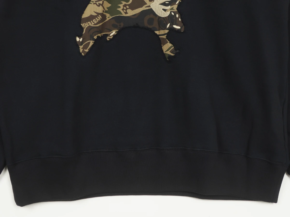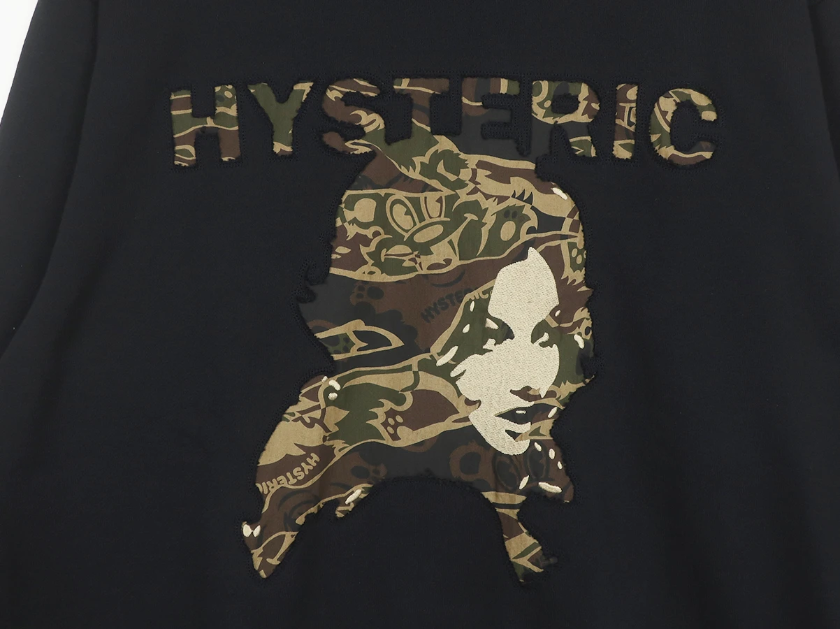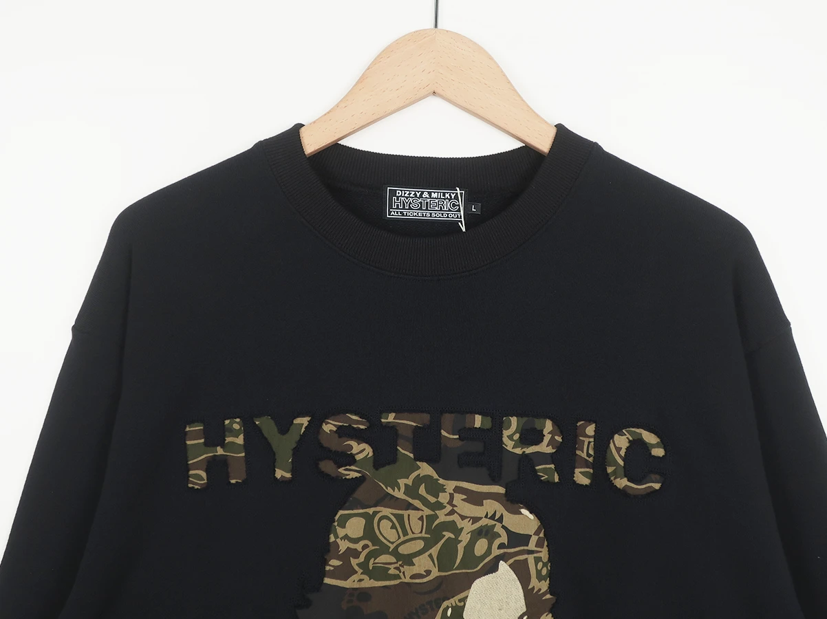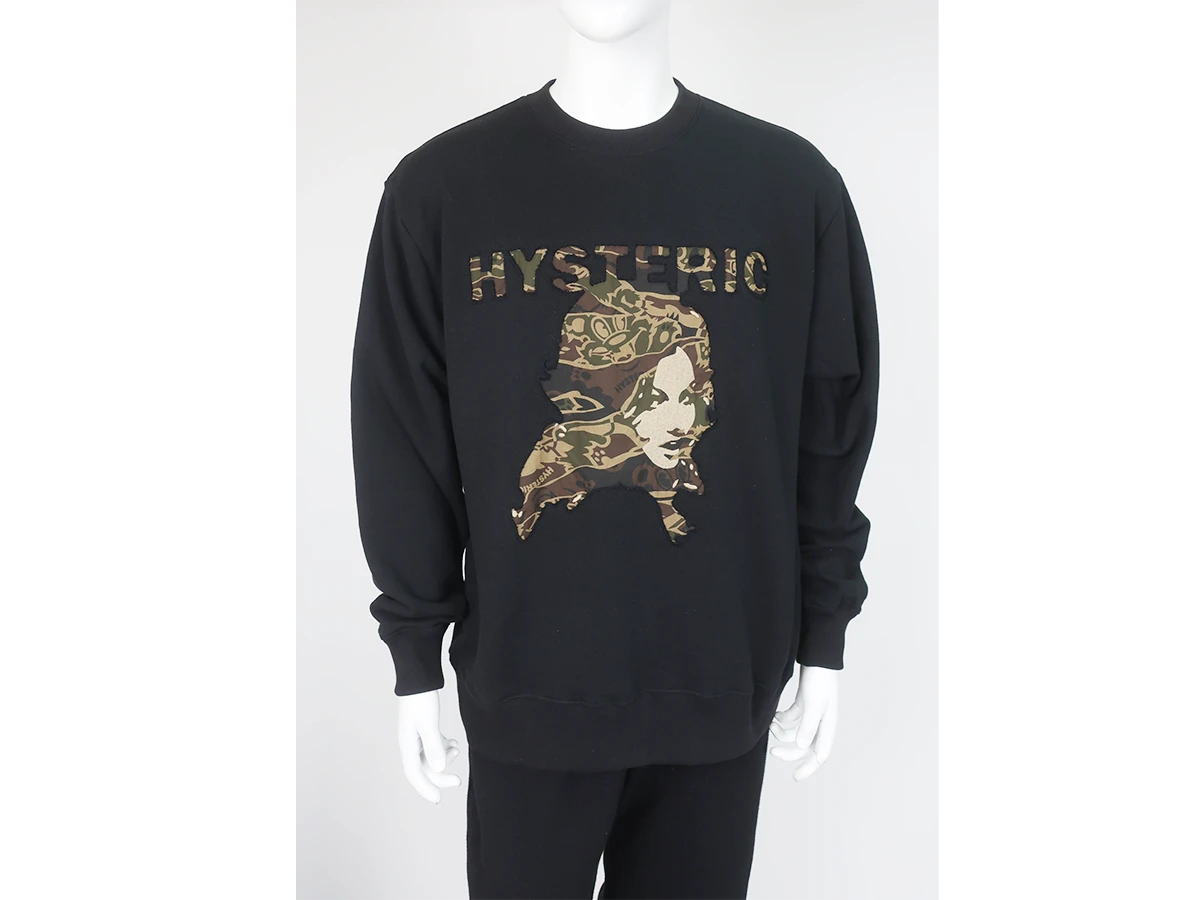 フロントには、オリジナルのカモフラージュ柄生地を裏からアップリケで重ね、表地を柄に合わせてカットアウトするという手の込んだ手法で HYSTERIC WOMAN を表現した、ミリタリー感のあるデザインのスウェット。