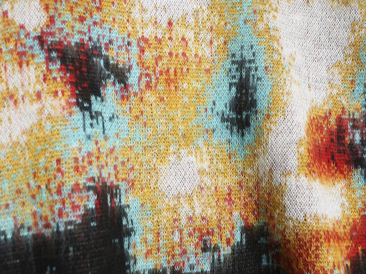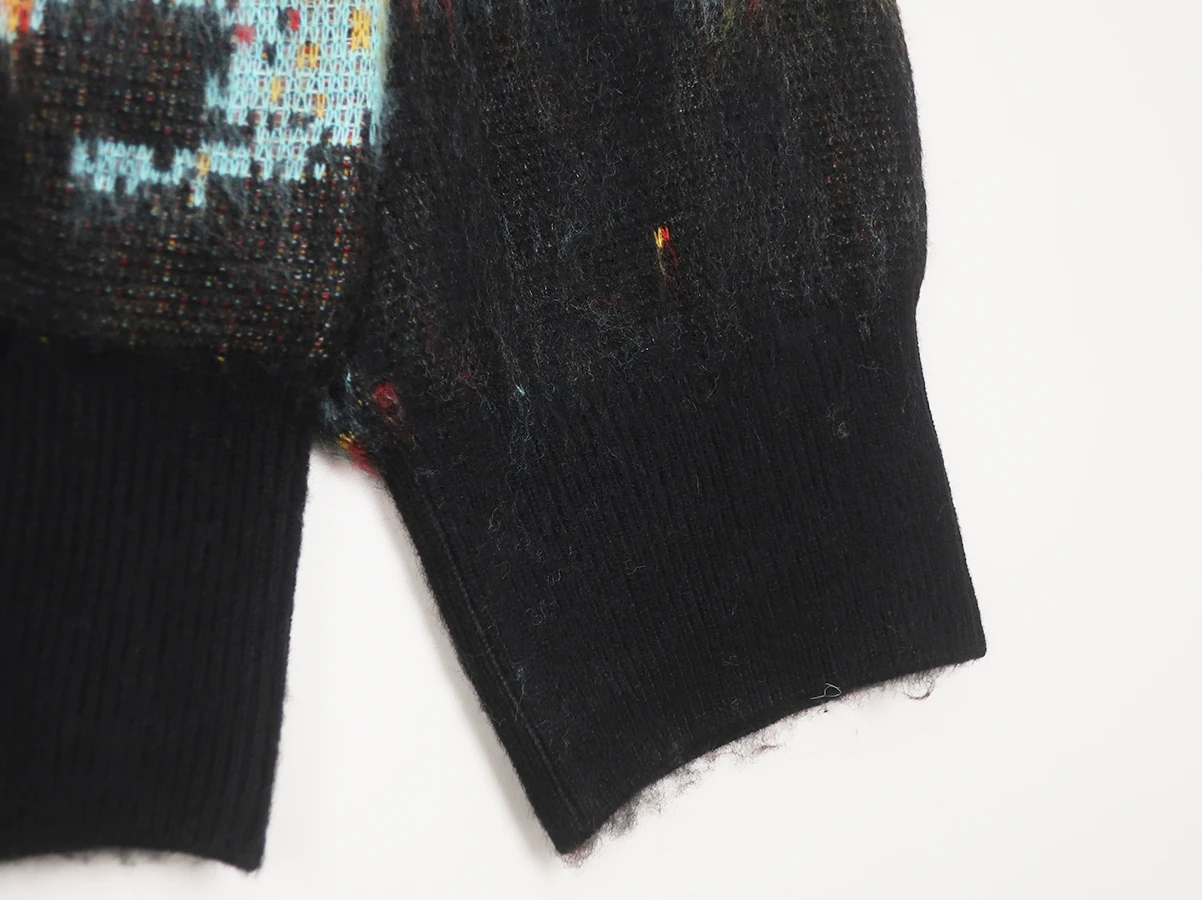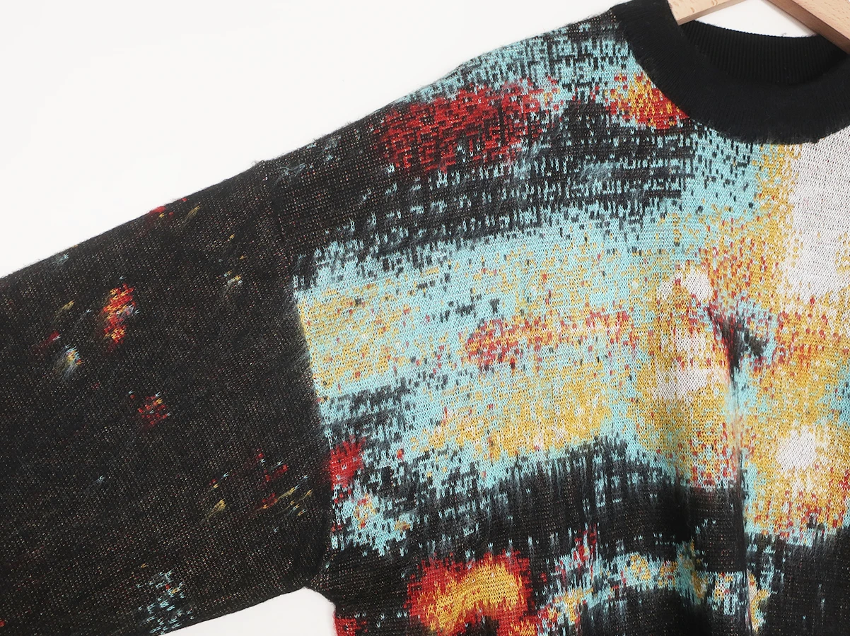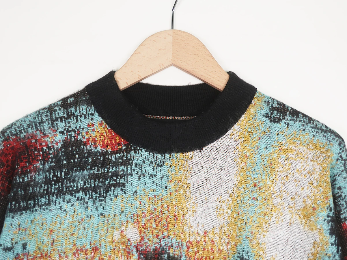 Contemporary Art Jacquard Prime-Over Crew Neck Shaggy Knit Pullover [ MLT1 ]