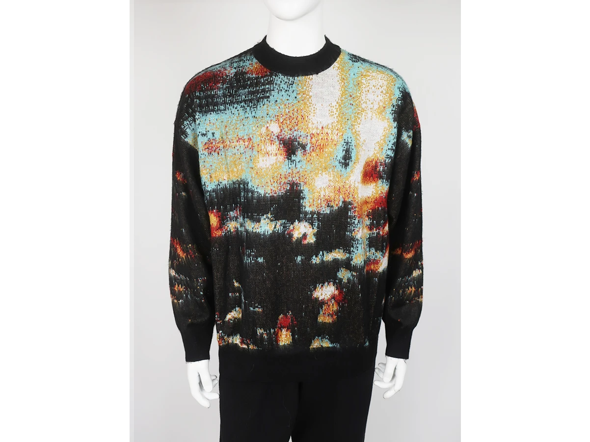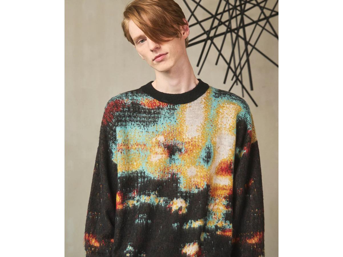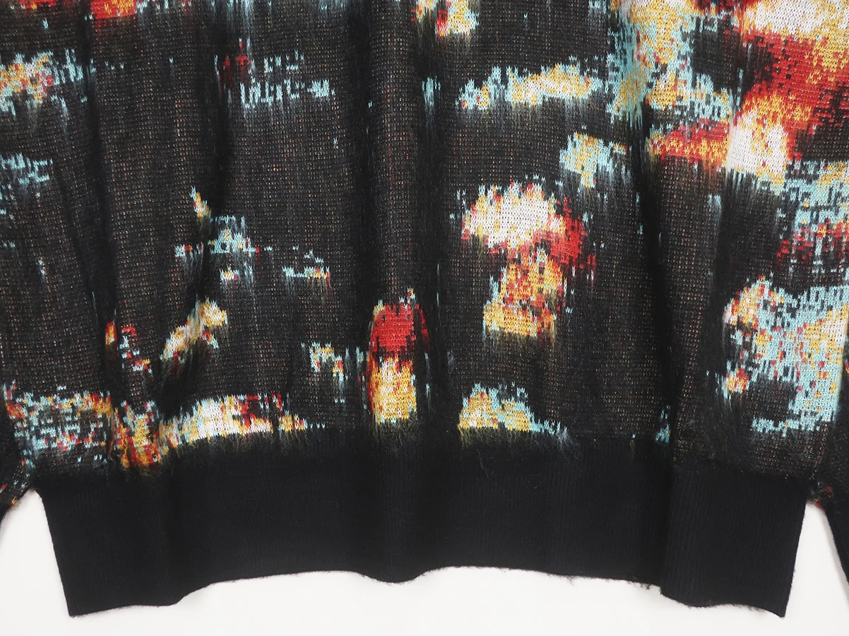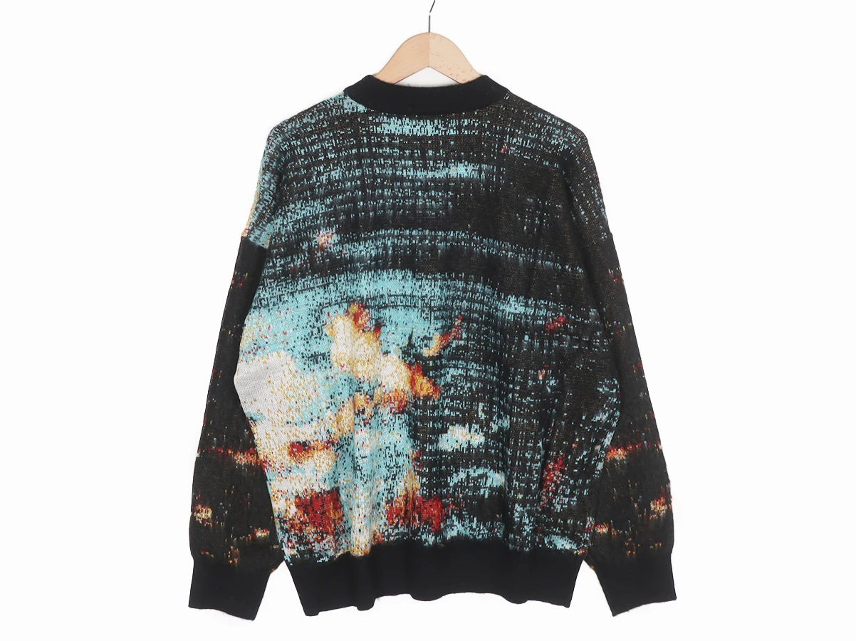 高度なジャガード技術によるグラデーションのように移り変わる色彩と大胆な構図が、見るたびに違った表情を見せてくれ感性を刺激されます。ラグジュアリーなムードを纏いながらもストリートライクに仕上げたデザイン。スウェットライクな厚みの編み地は快適な着用感ももたらします。重たくなる秋冬のコーディネートに主役級の1着です。