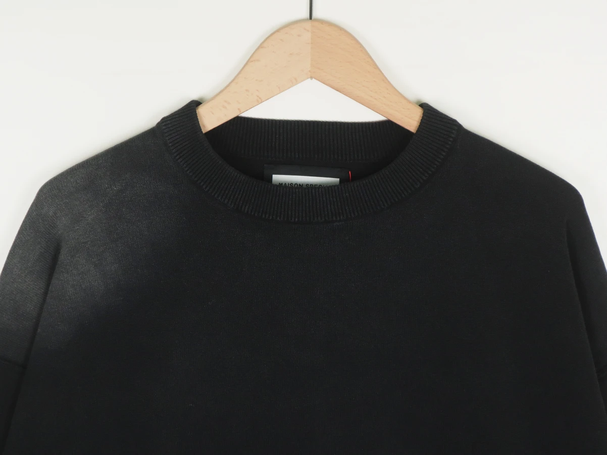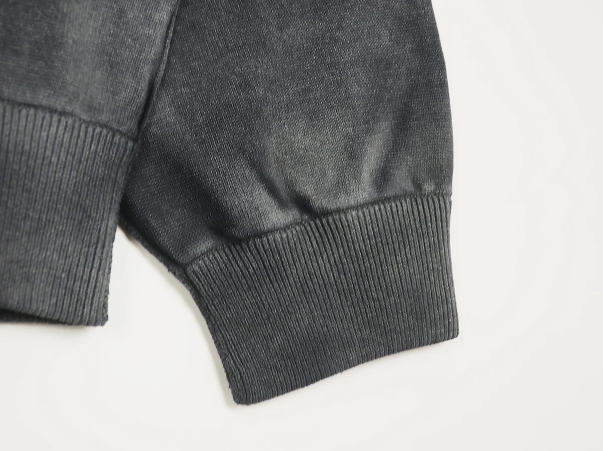コットン100%の12GG糸でハイゲージに編立て、製品でスプレーブリーチによる脱色加工を施した素材を使用。