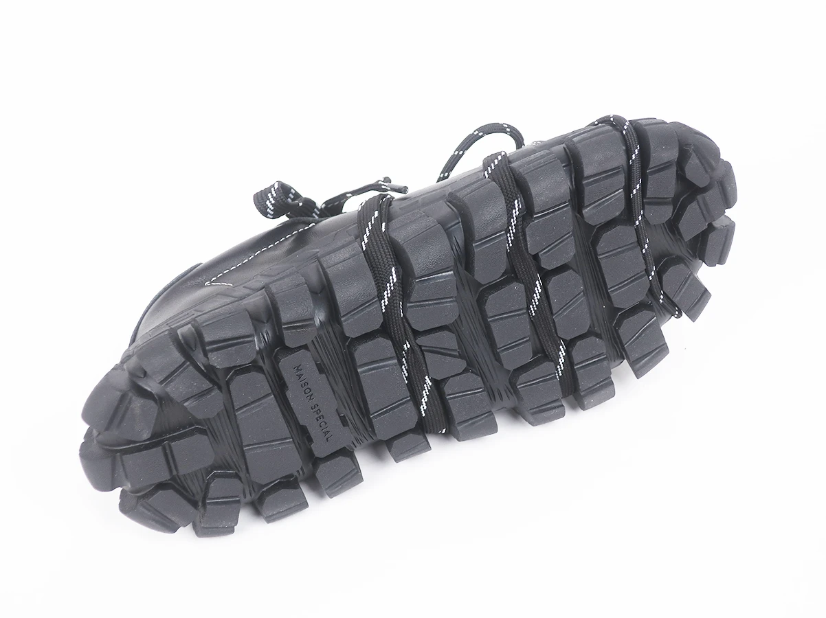 オフロードタイヤのようなゴツゴツとした立体的感と、フリーハンドで描いたような不規則なデザインを織り交ぜ、一目見たら忘れられないデザインのソールに仕上げました。見た目のインパクトはもちろん、長時間の使用でも疲れを感じさせない軽さと高いグリップ性を誇り、実用面でも申し分のない機能性も兼ね備えております。