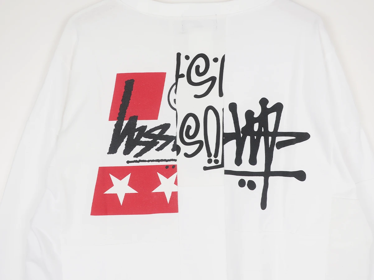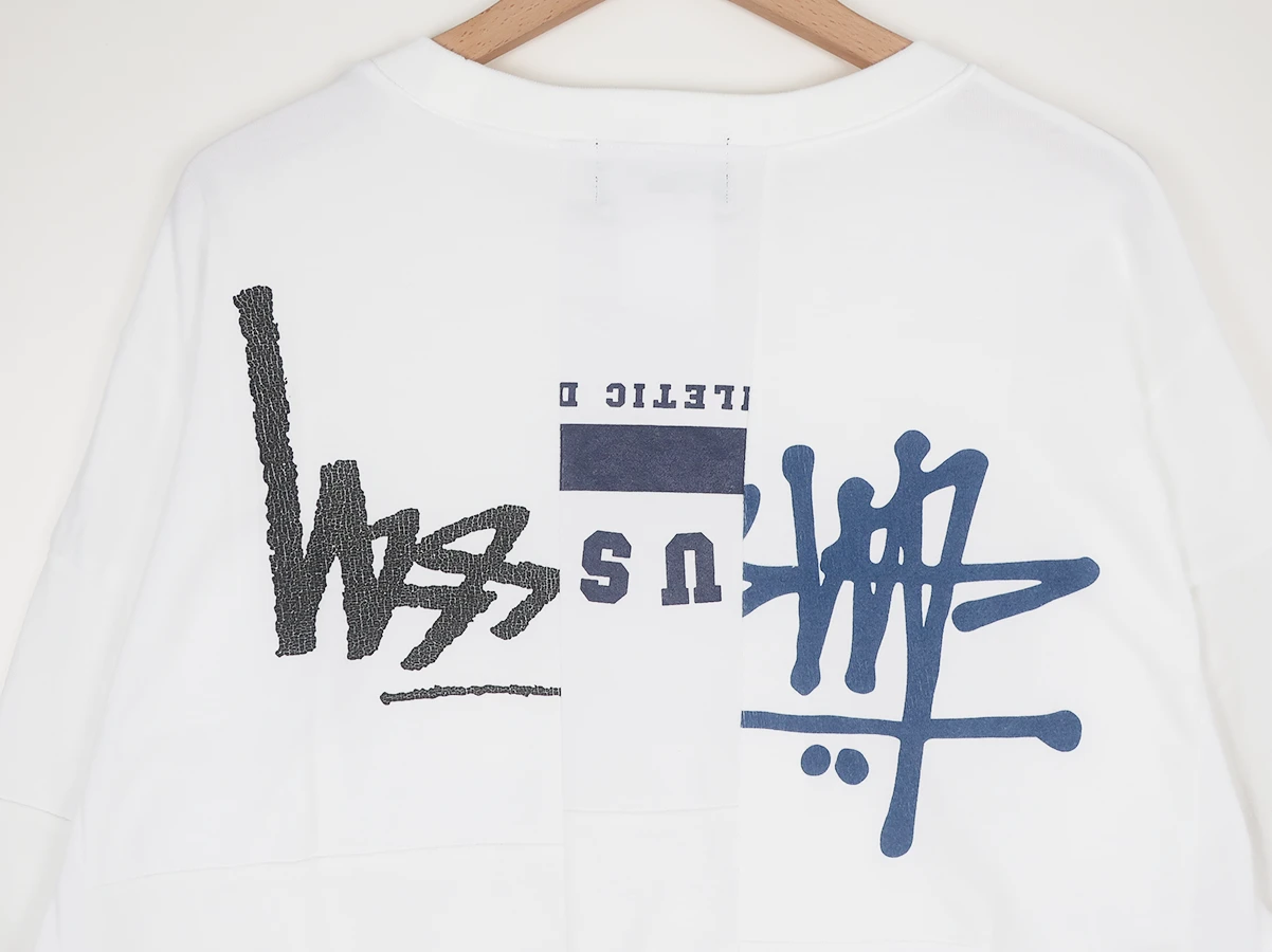 見頃に両端は代表的なストックロゴ、ペーシックロゴと中点はその他ロゴのオールドステューシーのプリントを用いたパッチワークが施されており、プリントの豊富さや年代への違いを楽しめるアイテムであり全て1点物となっています。