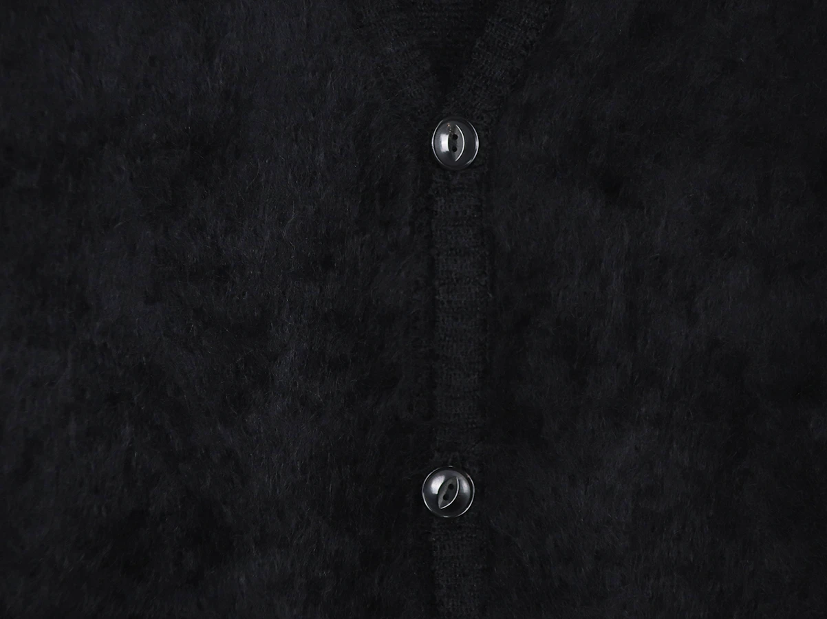 毛足の長いモヘア素材を使用した、ウォーム感のあるカーディガン。複数の糸をミックスすることで深みのある色合いを表現し、上品さと存在感を兼ね備えた一着に仕上げられています。