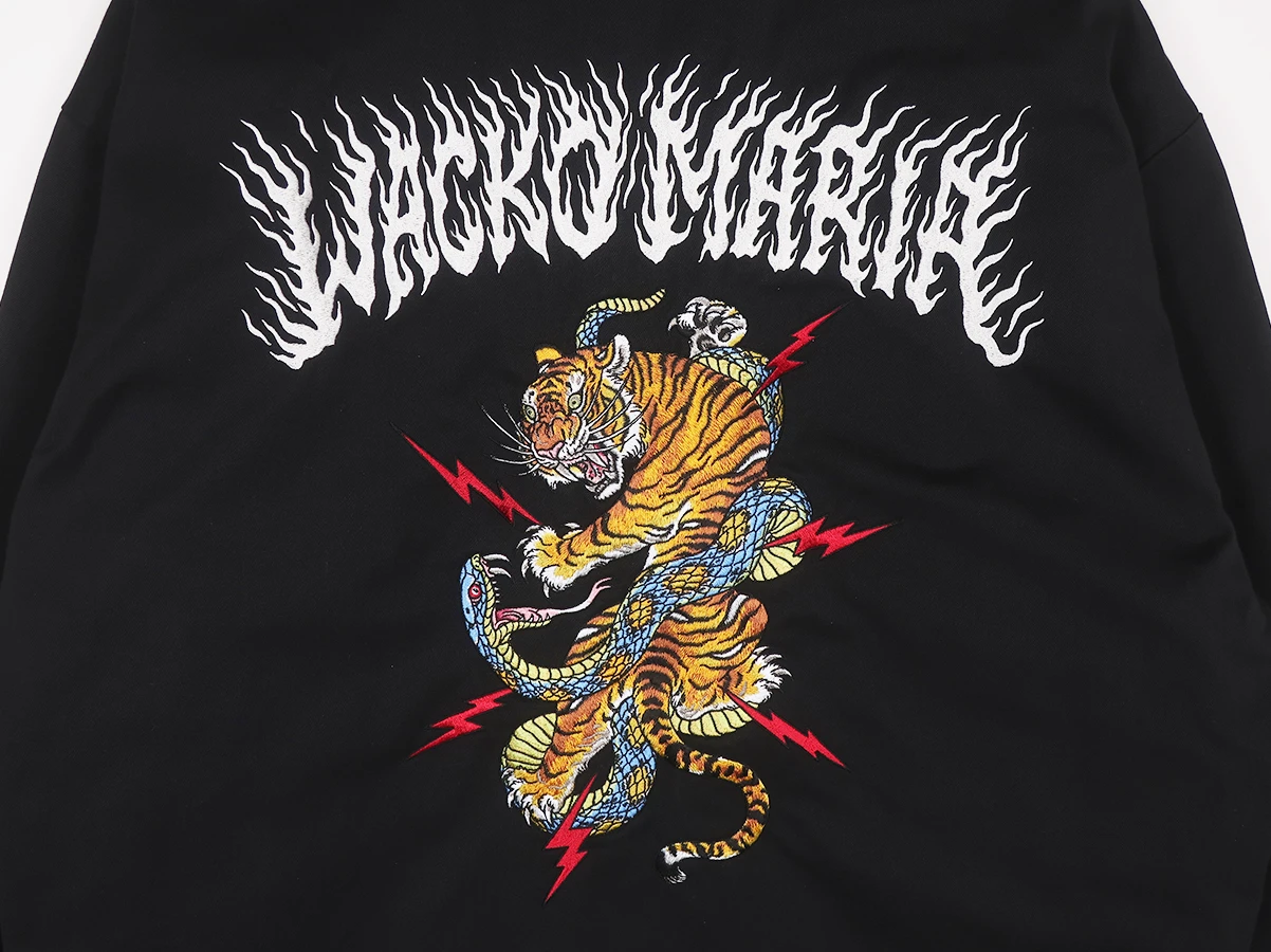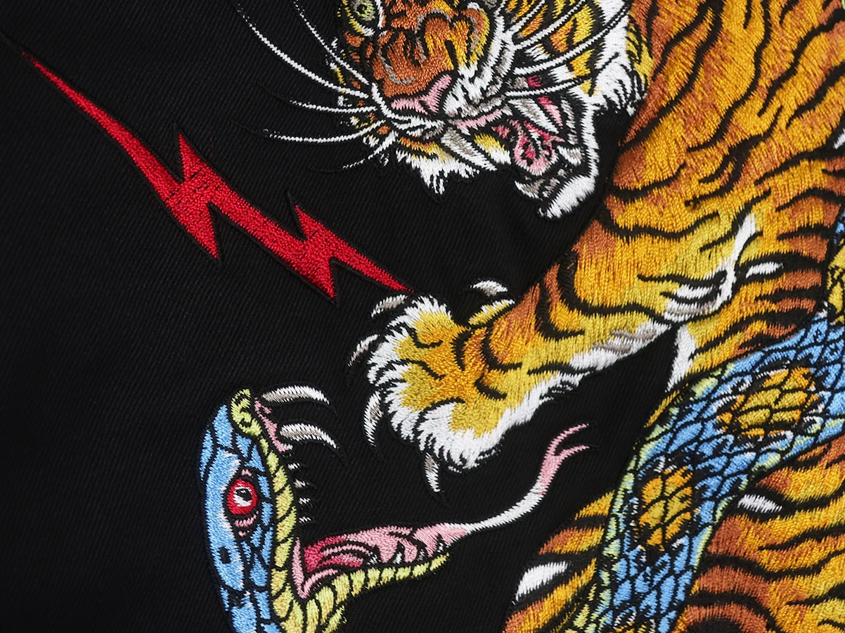 虎や龍などオリエンタルなモチーフを独自のタッチで描き出し、ブランドが得意とするアート性の高い一着に仕上げられています。程よいハリのあるコットンツイル生地を使用し、着込むほどに風合いが増す素材感。胸元や背面の刺繍に加え、パイピング仕様など細部まで丁寧な作りが魅力です。