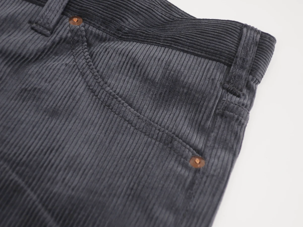 程よい太さの畝が特徴のコットン100%コーデュロイを採用し、柔らかな穿き心地と上品な光沢感を兼ね備えています。フロントボタンにはLeeの刻印、背面にはレザーパッチを配し、両ブランドの個性を感じさせる仕上がり。
