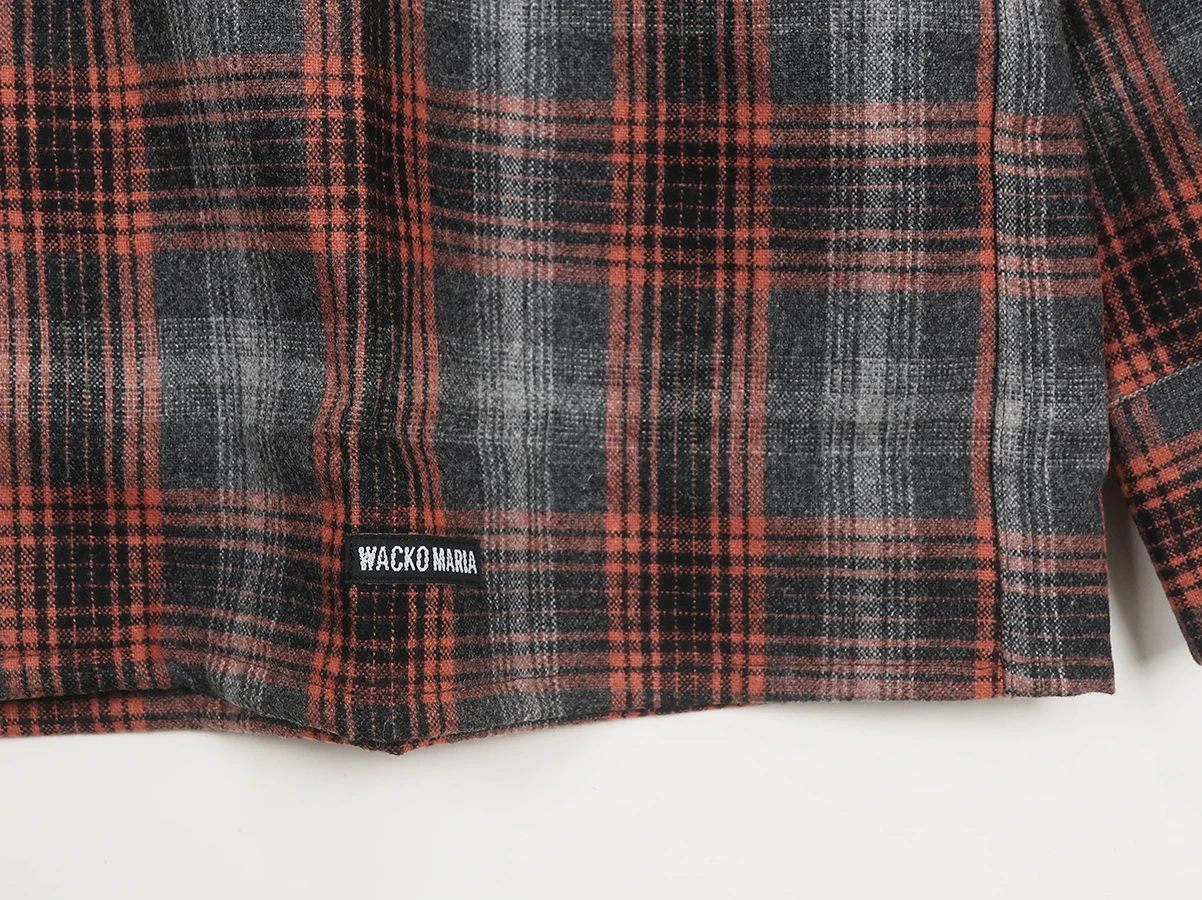 全体に美しいグラデーションを描くオンブレチェック柄を配し、温かみと上品さを兼ね備えた一着。ウール・ナイロンの生地は軽くて柔らかく保温性にも優れています。左胸にポケット、裾部分にはWACKO MARIAのパッチを配置。