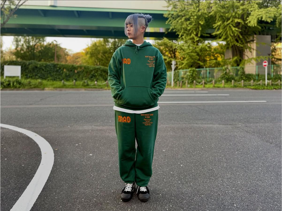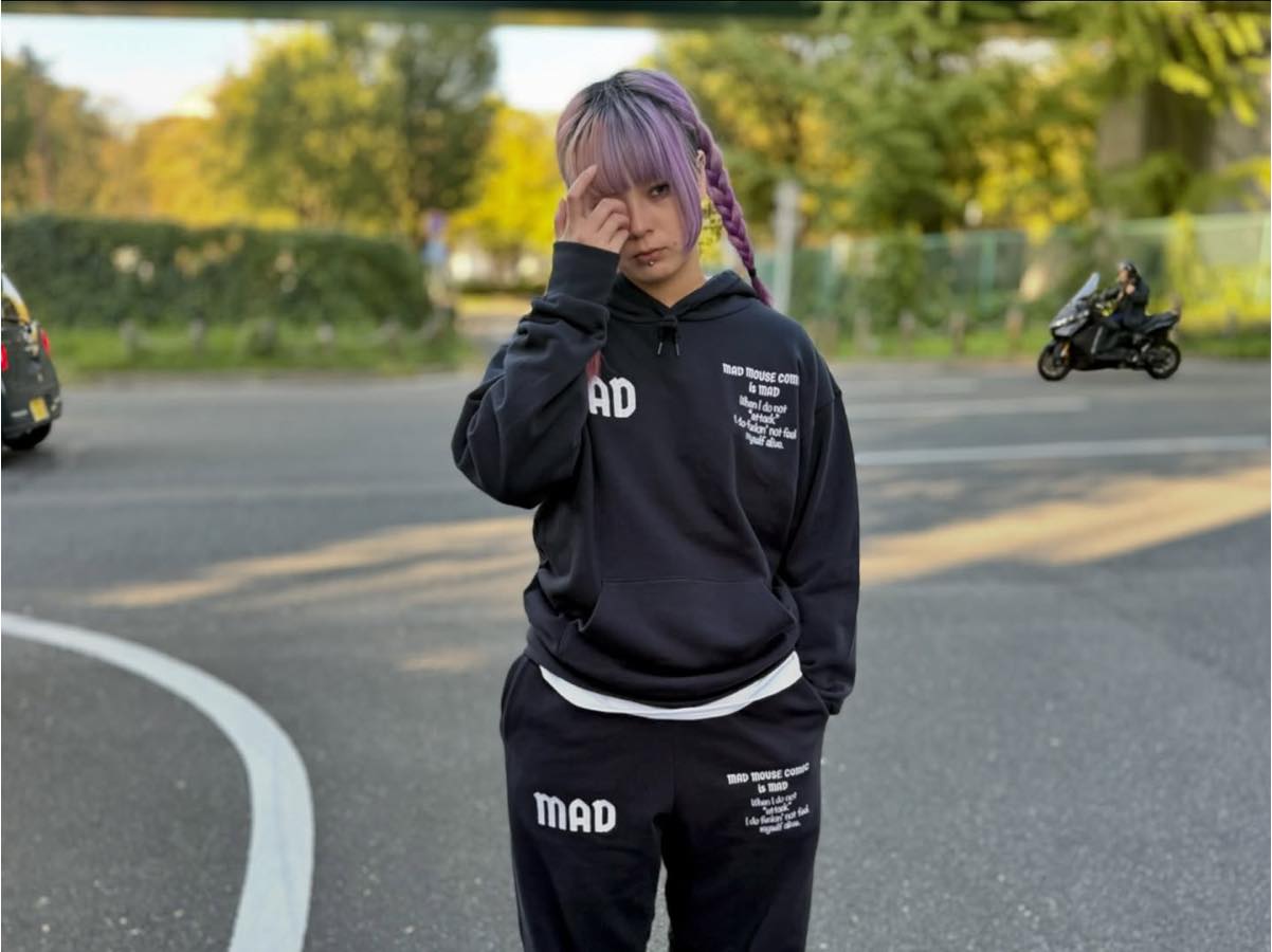 「MAD」と「MAD MOUSE COMIC is MAD When I do not ‘attack’ I do fuckin’ not feel myself alive.”(MAD MOUSE COMICはMADだ。「攻撃」しないと生きてる気がしない)というフレーズが刺繍で表現されたインパクトのあるデザインです。