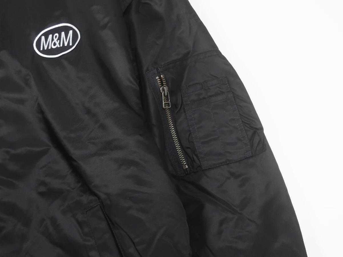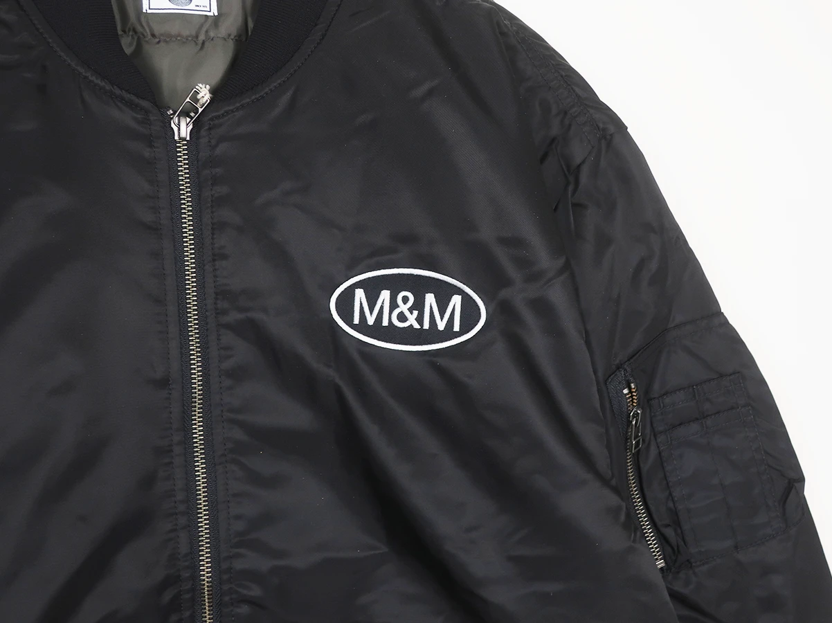 フロントはシンプルなジップ仕様に、胸元のM&Mロゴ刺繍がさりげないアクセント。