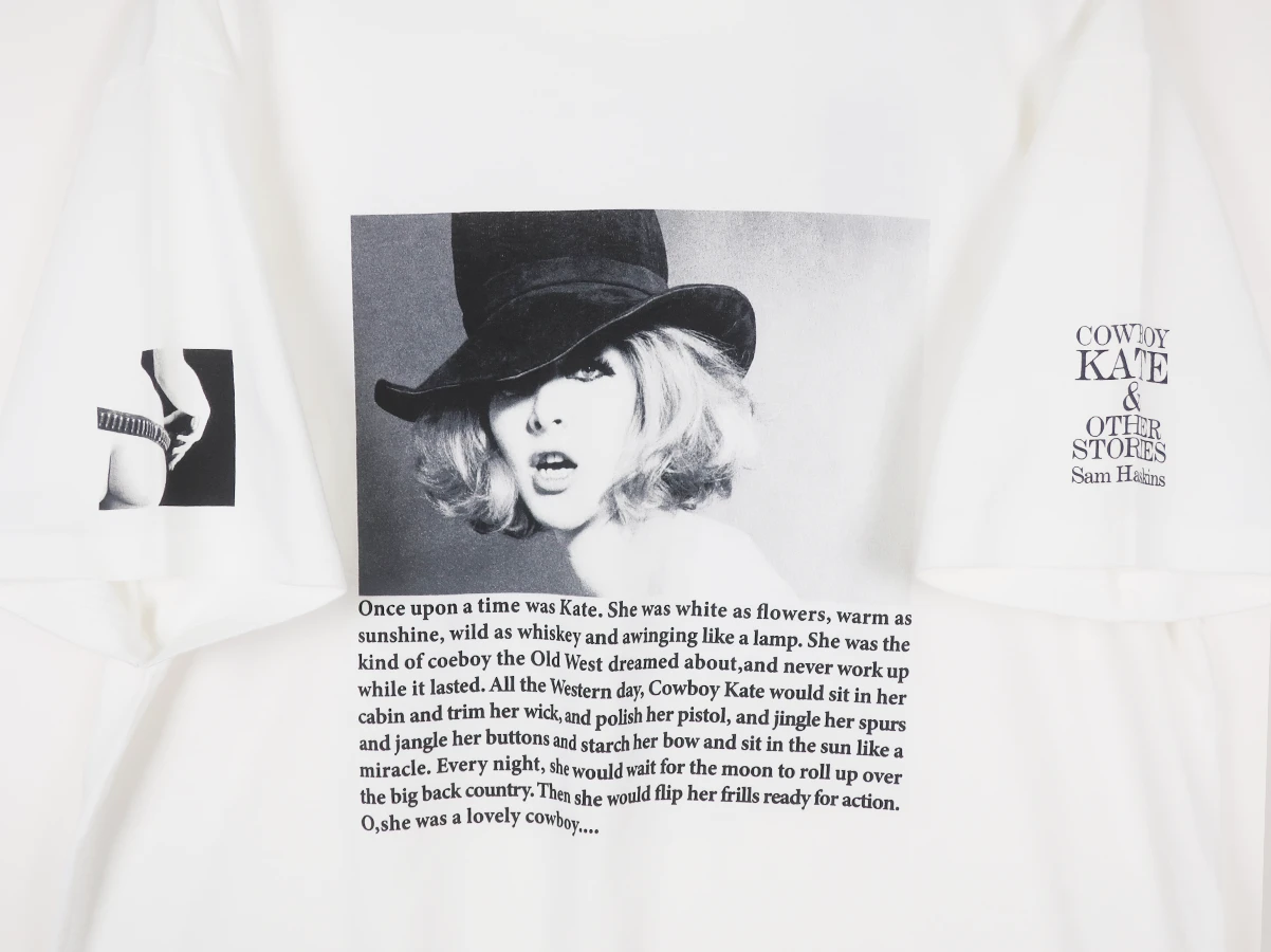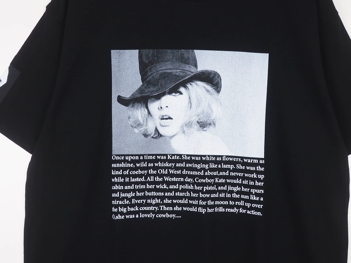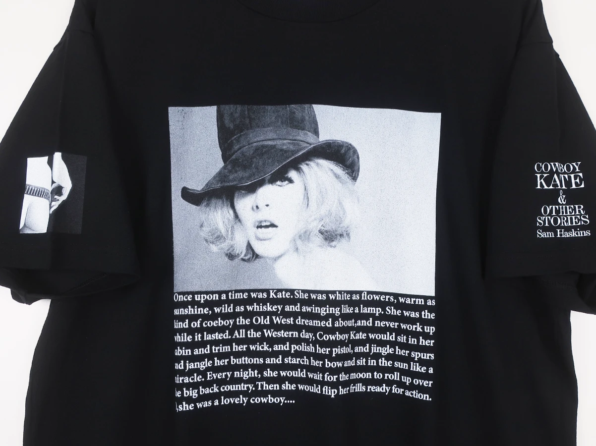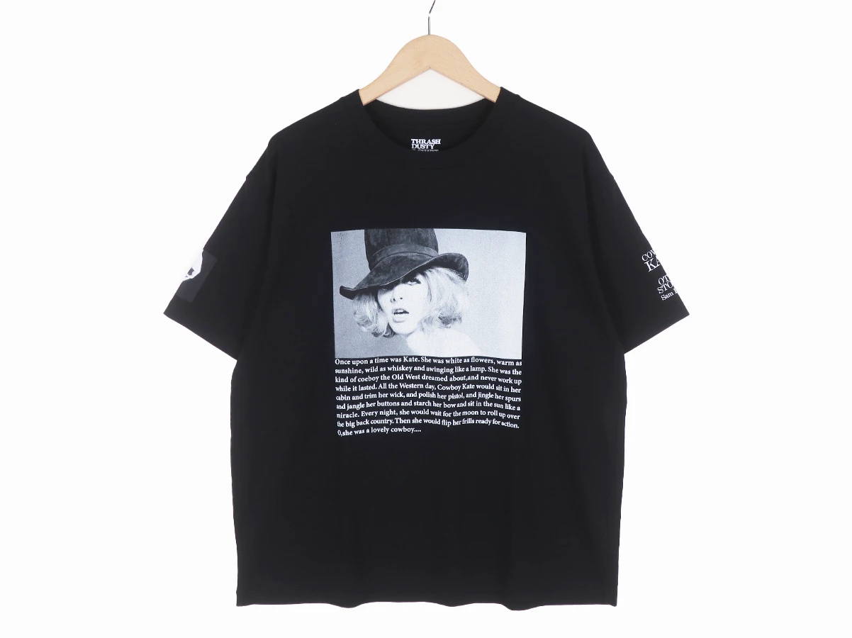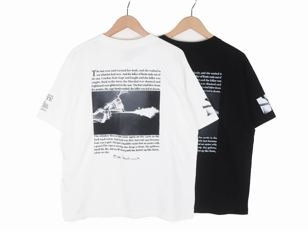 フロントには、『COWBOY KATE & OTHER STORIES』を象徴するKateの写真を使用、バックプリントには銃を発砲した瞬間を捉えた写真をそれぞれプリント。ボディーは17番単糸の空紡糸を使用したドライタッチな天竺素材を使用したTシャツ。
