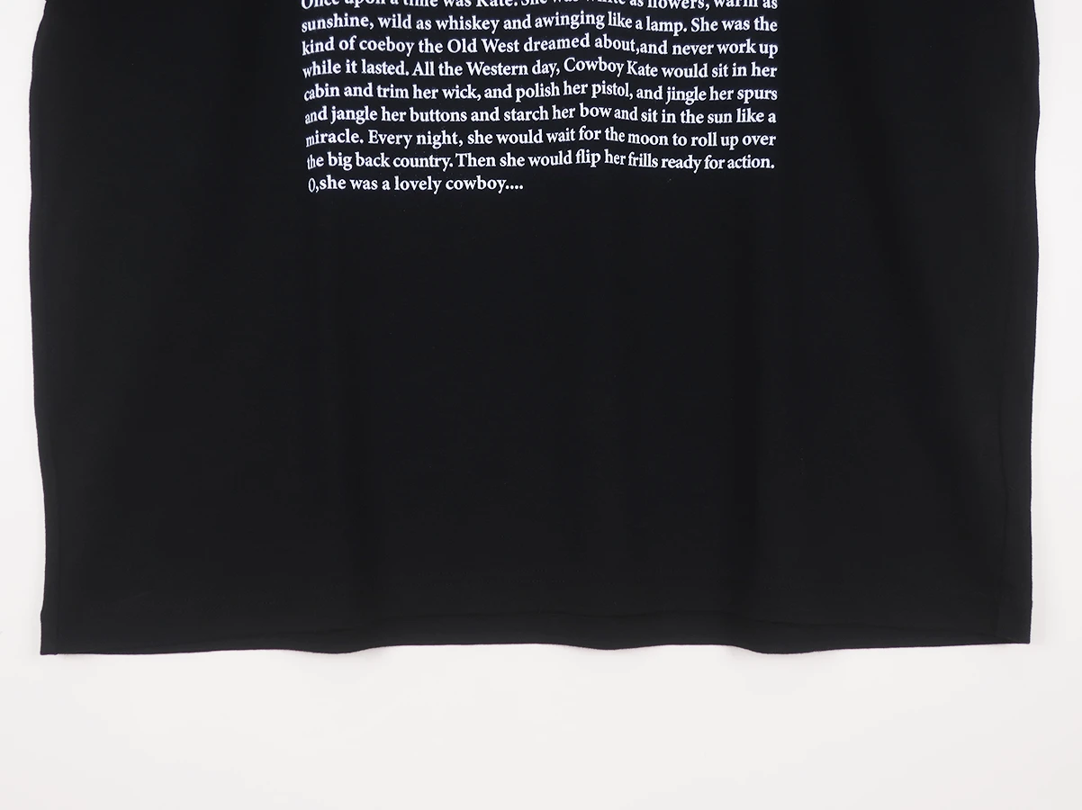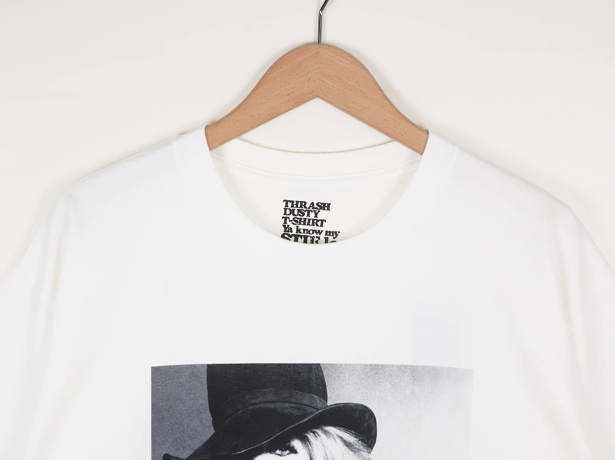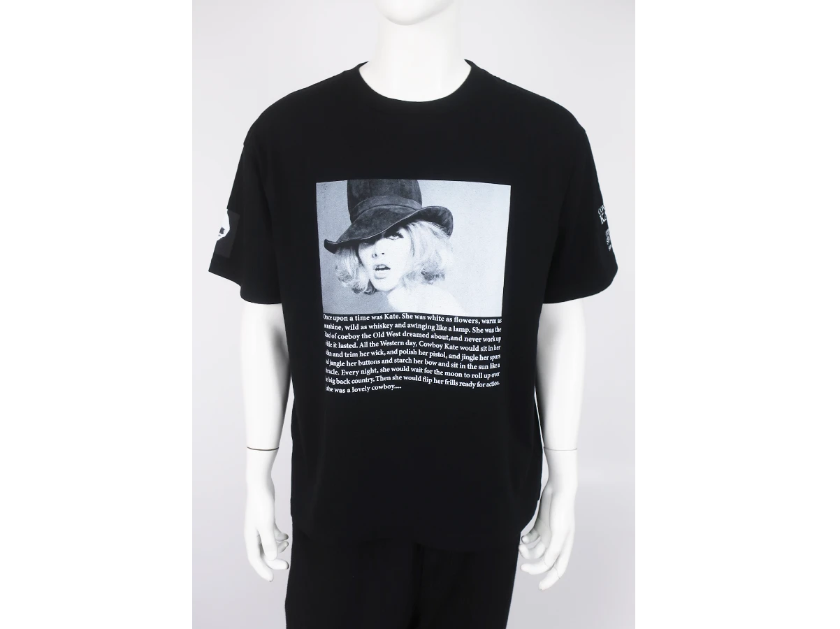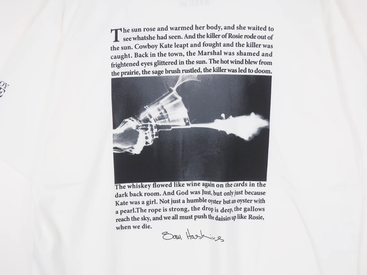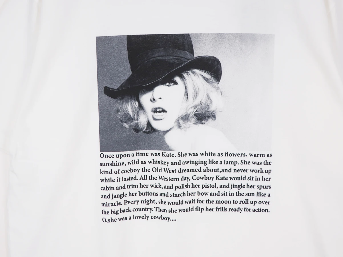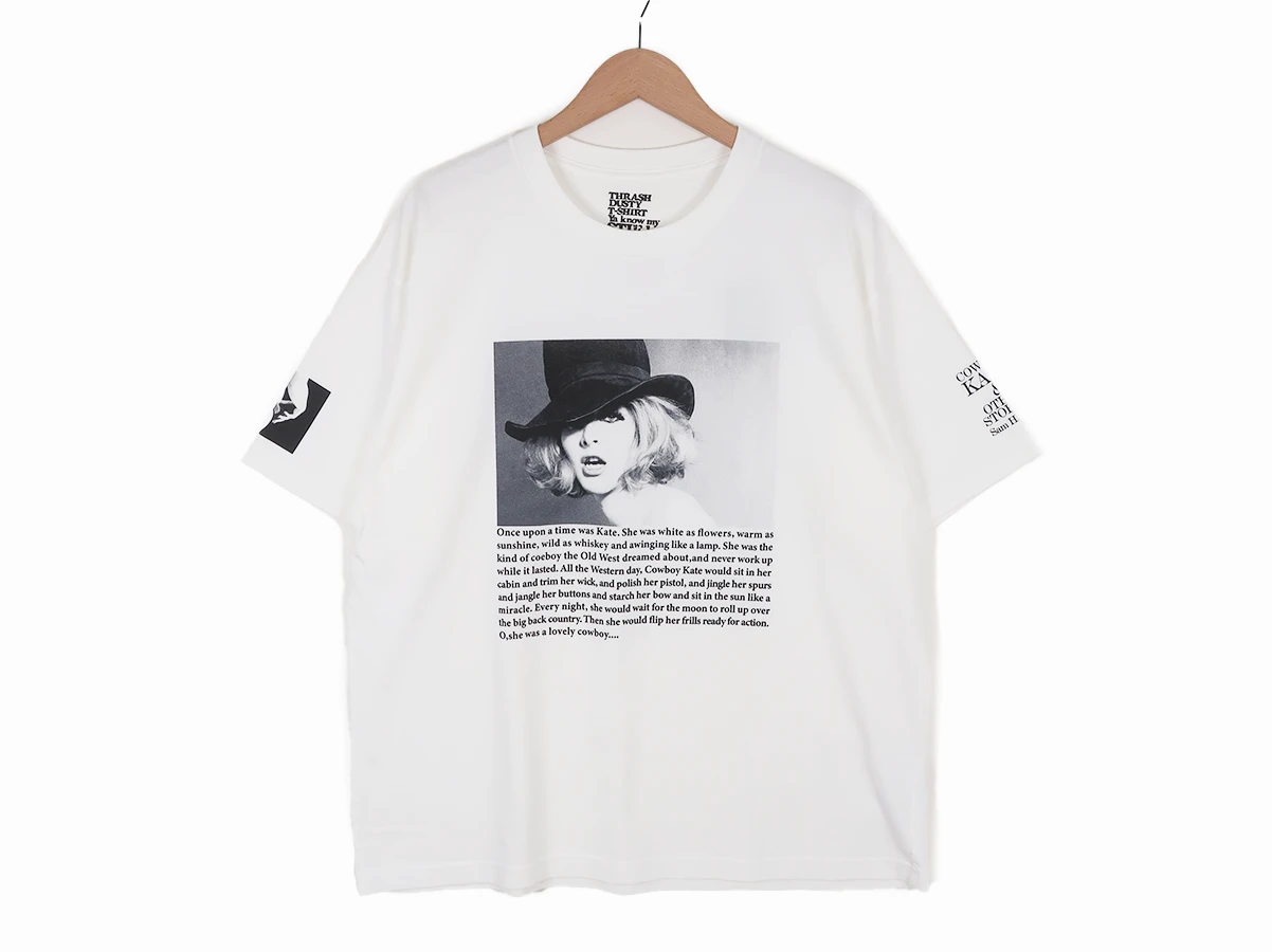 フロントには、『COWBOY KATE & OTHER STORIES』を象徴するKateの写真を使用、バックプリントには銃を発砲した瞬間を捉えた写真をそれぞれプリント。ボディーは17番単糸の空紡糸を使用したドライタッチな天竺素材を使用したTシャツ。