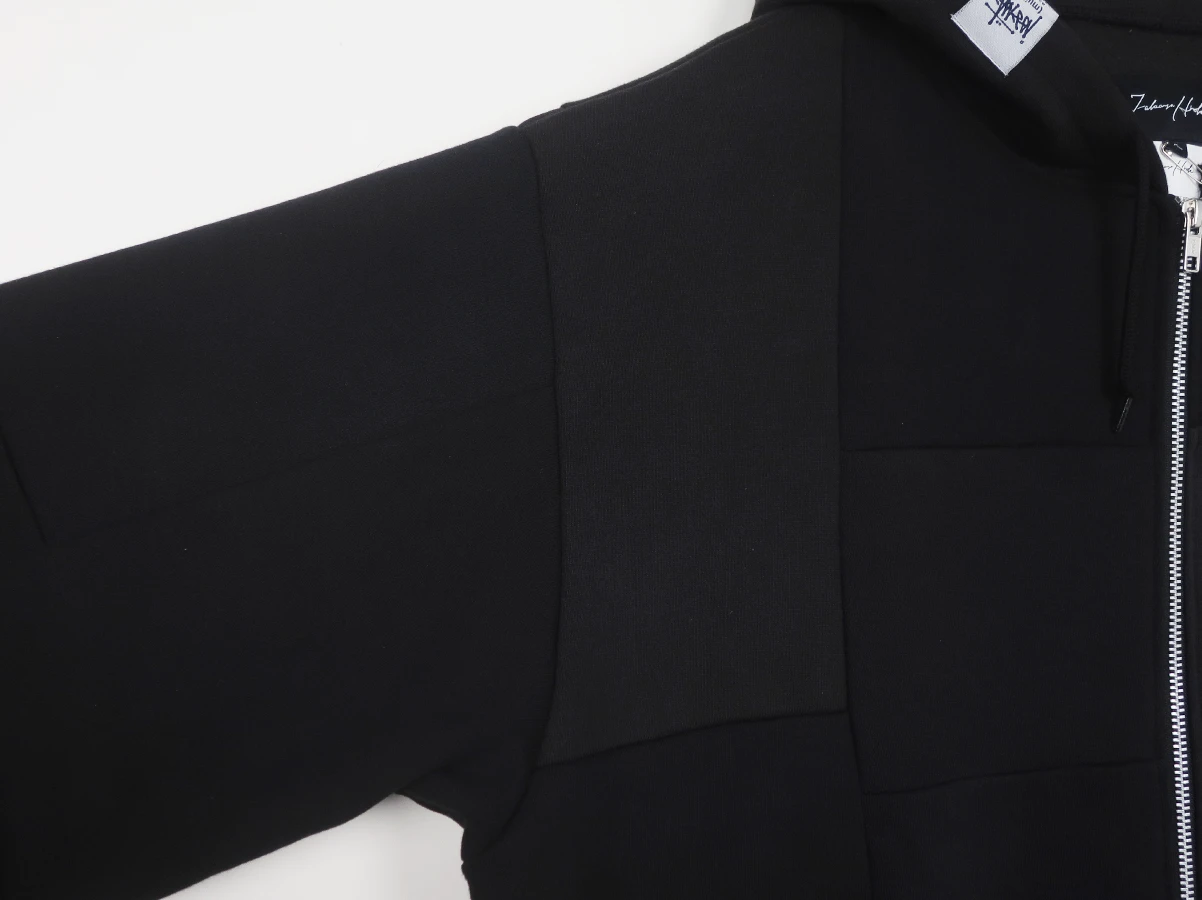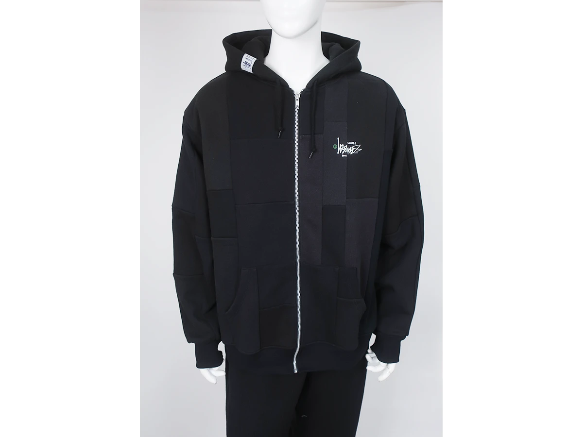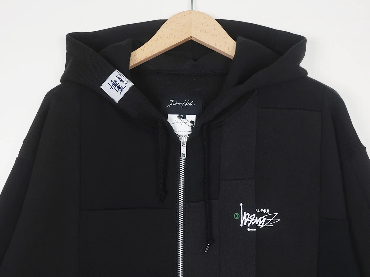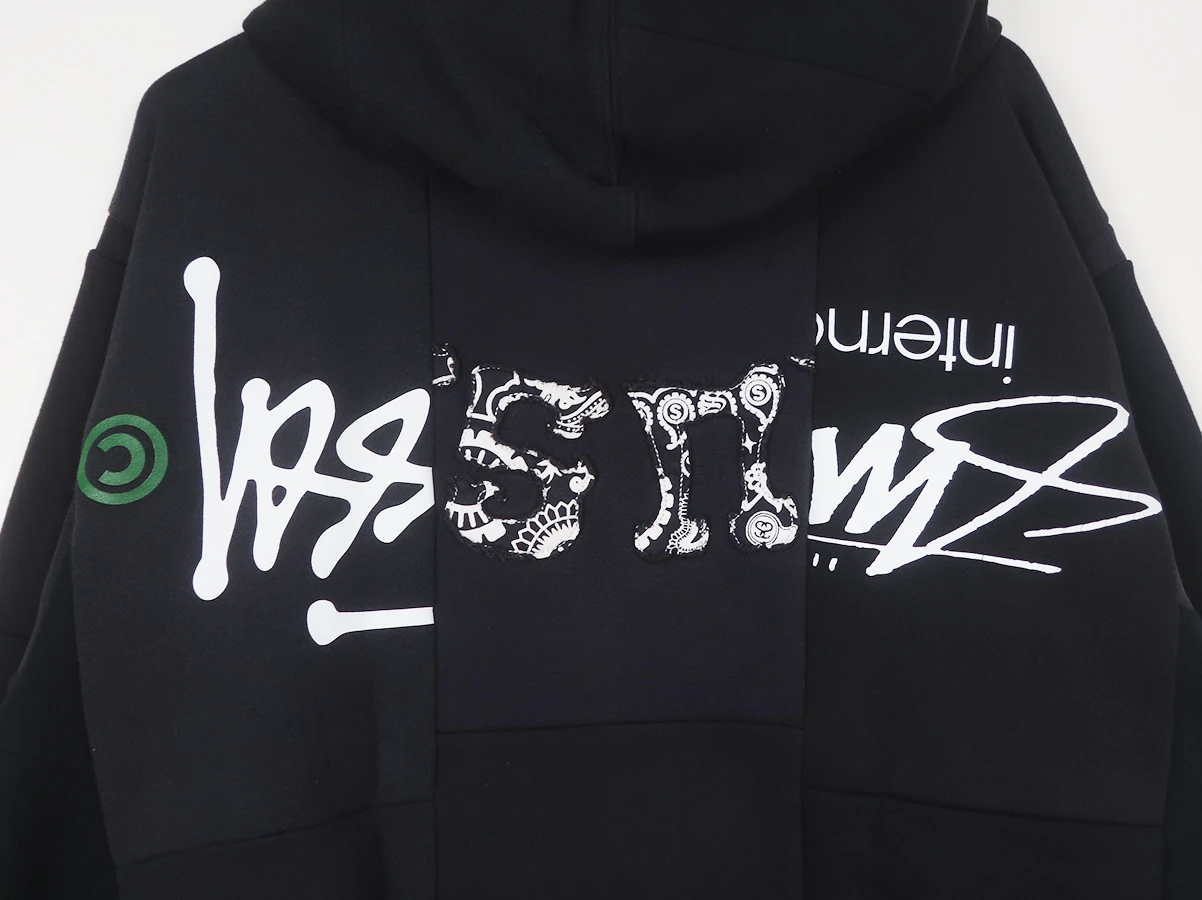 90s後半以降の STUSSY スウェットを主軸に組み合わせ、パッチワークを施したパーカーです。本作は、STUSSYプルオーバーパーカーで最もポピュラーな年代である 00s モデルからインスピレーションを受け、パターンやデザインもOOs ジップアップパーカーをベースに、現代的な感覚で再構築しています。