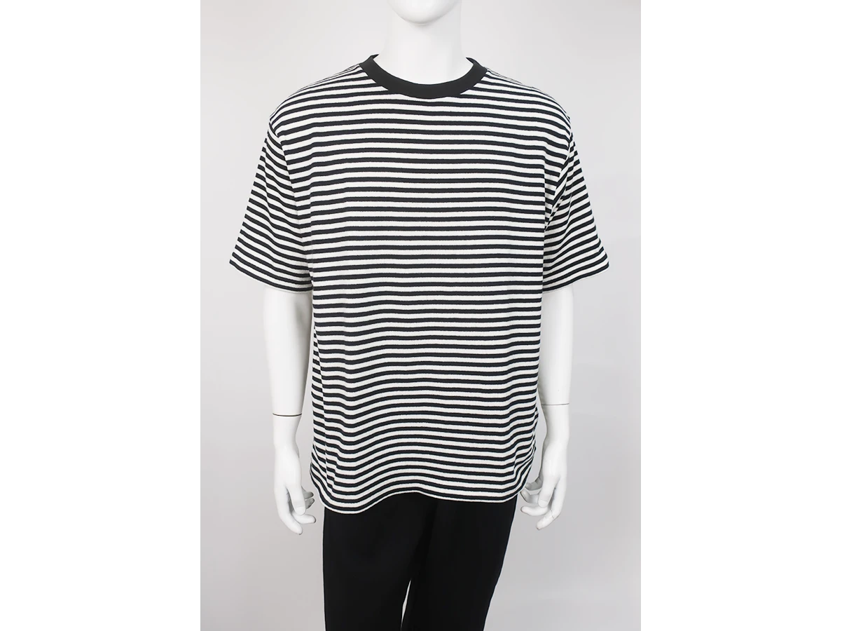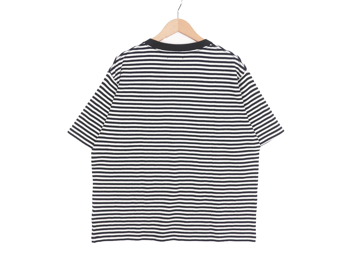 20/2先染めボーダー天竺を使用した、半袖クルーネック。ローゲージ編み機で編み立てた、ニットのような豊かな表情と奥行きになっており、上質で柔らかなタッチが魅力。