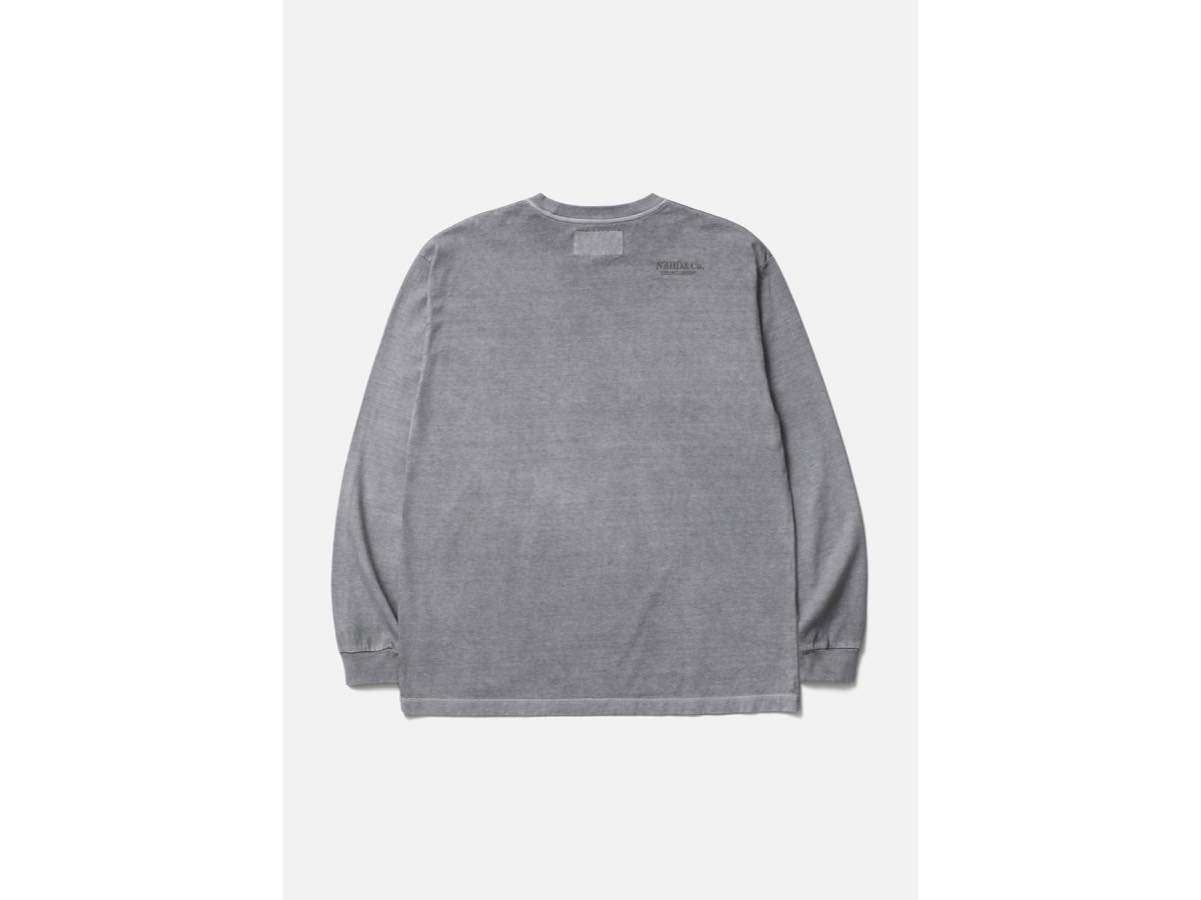 製品の状態で顔料染め加工を施した、天竺素材の長袖クルーネックカットソー。右後ろ肩にロゴを刺繍。左裾にブランドタグ、脇接ぎにピスネームを付属。
