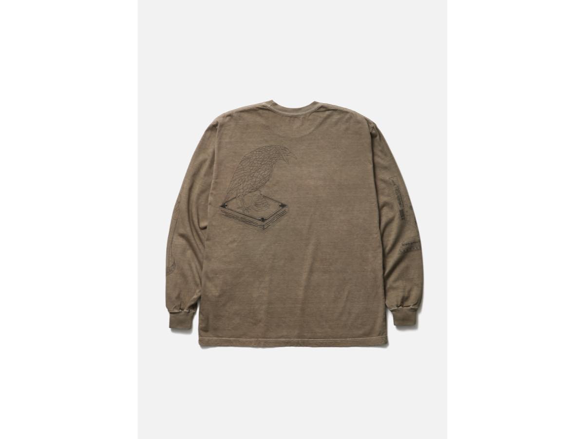 コットン天竺のオリジナルボディをベースに、顔料染め加工を施したロングスリーブTシャツ。インセンスチャンバーモチーフのグラフィックをプリント。ワンウォッシュ仕上げ。