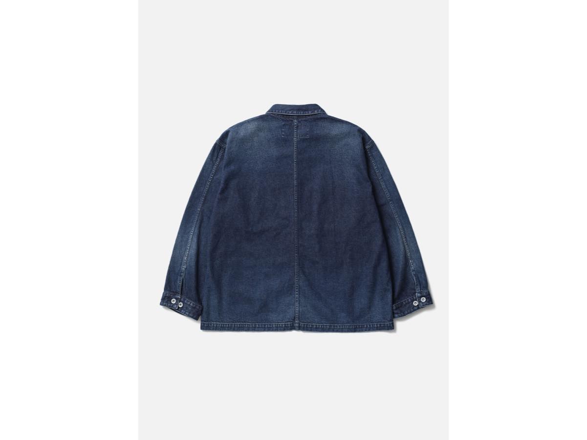 特殊な洗い加工を施した10.3oz三綾デニム生地のカバーオールジャケット。デニム本来の色味を残しつつ自然な経年変化を再現。オリジナルタックボタンを採用。ポケットにブランドタグ、脇接ぎにピスネームを付属。