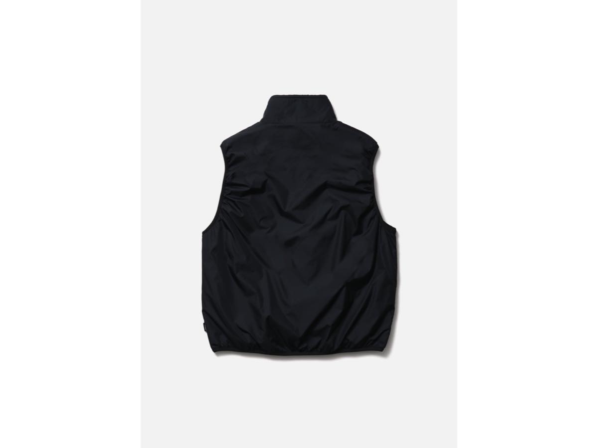 程よいハリ感を持ちつつナイロン独特の優しい風合いと撥水性を兼ね備える高密度ナイロンタフタ素材を使用したソフトシェルベスト。フロントに3つのジップポケットを配備。アームホールと裾はニットパイピング仕様。左胸にロゴをプリント。左裾にブランドタグ、脇接ぎにピスネームを付属。アンチピリングのフリース裏地。