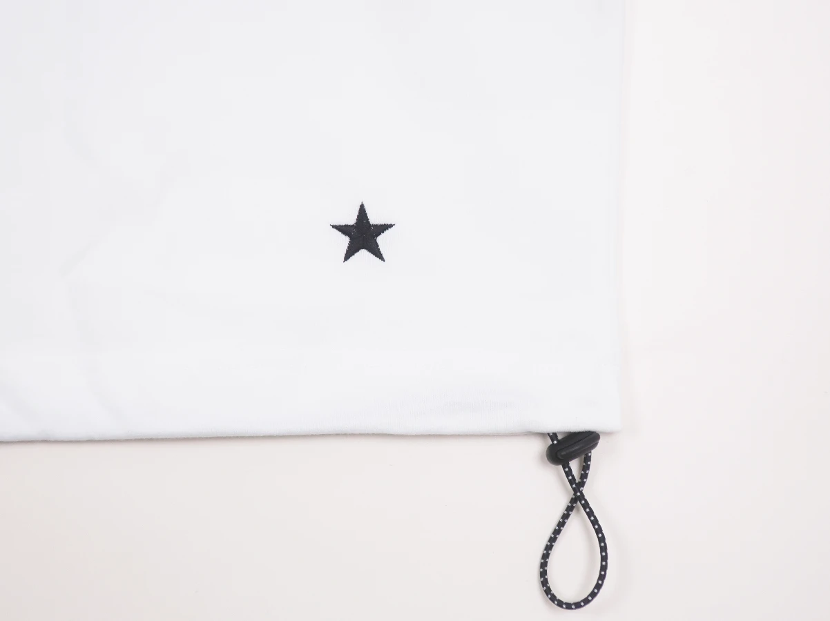 フロントにはブランドロゴ、背面裾には星刺繍を配置。裾のドローコードを絞ることでシルエットの調整が可能。スタイリングに合わせてシルエットの変化を楽しめる一着です。