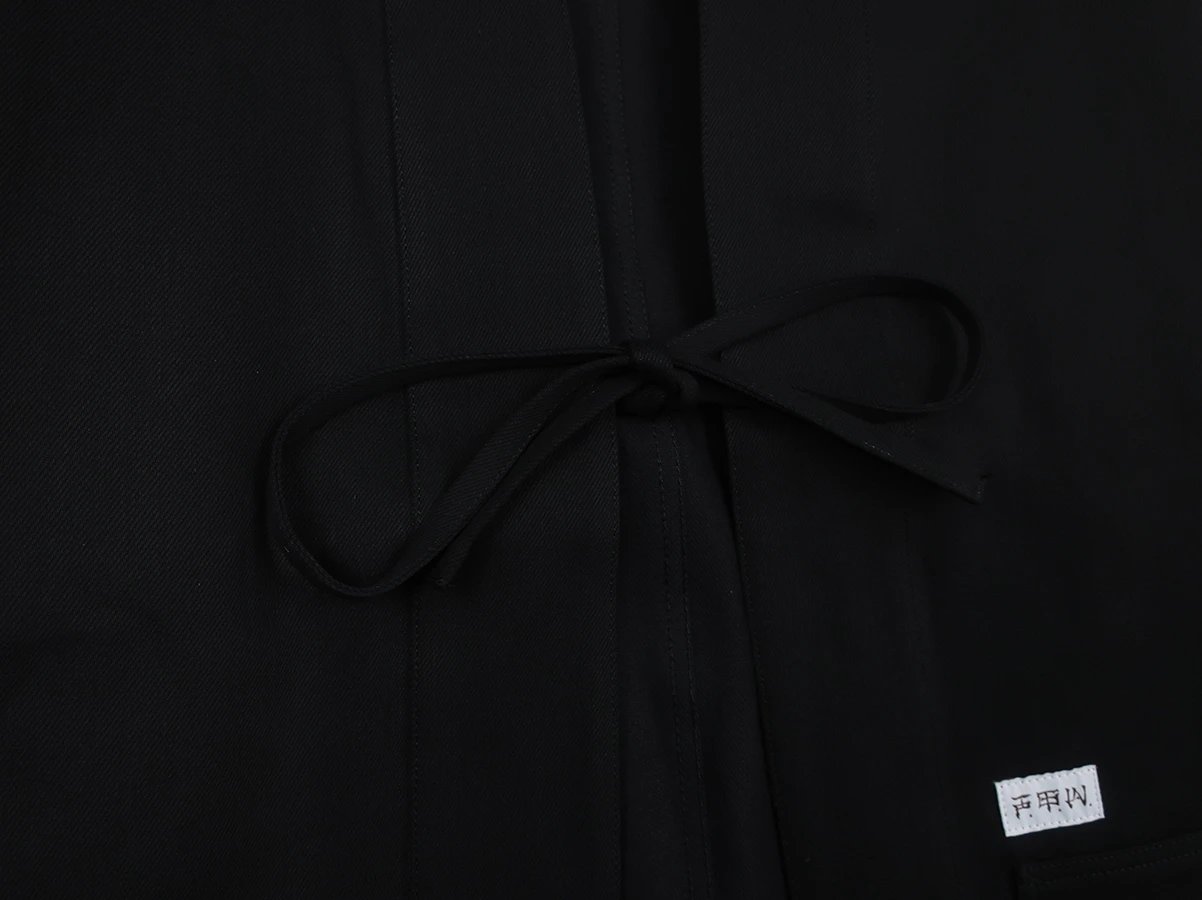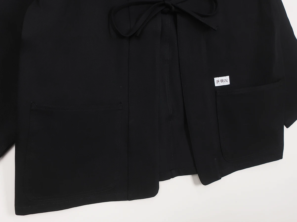 フロントは紐で留める仕様でゆったりとしたシルエットに仕上げています。フロントには大きめのパッチポケットを配置。