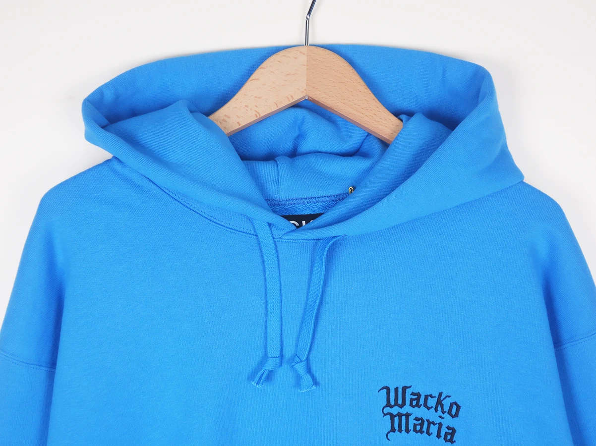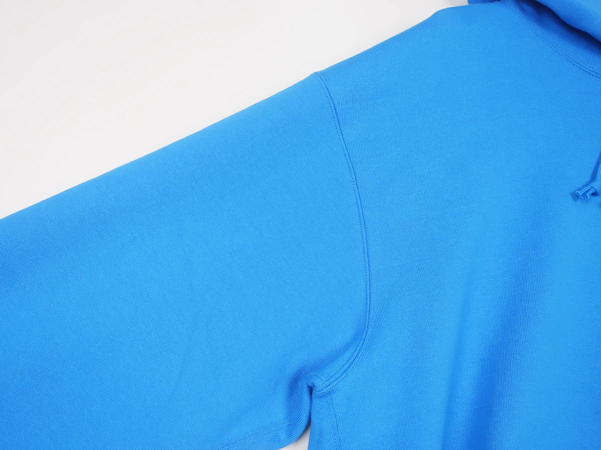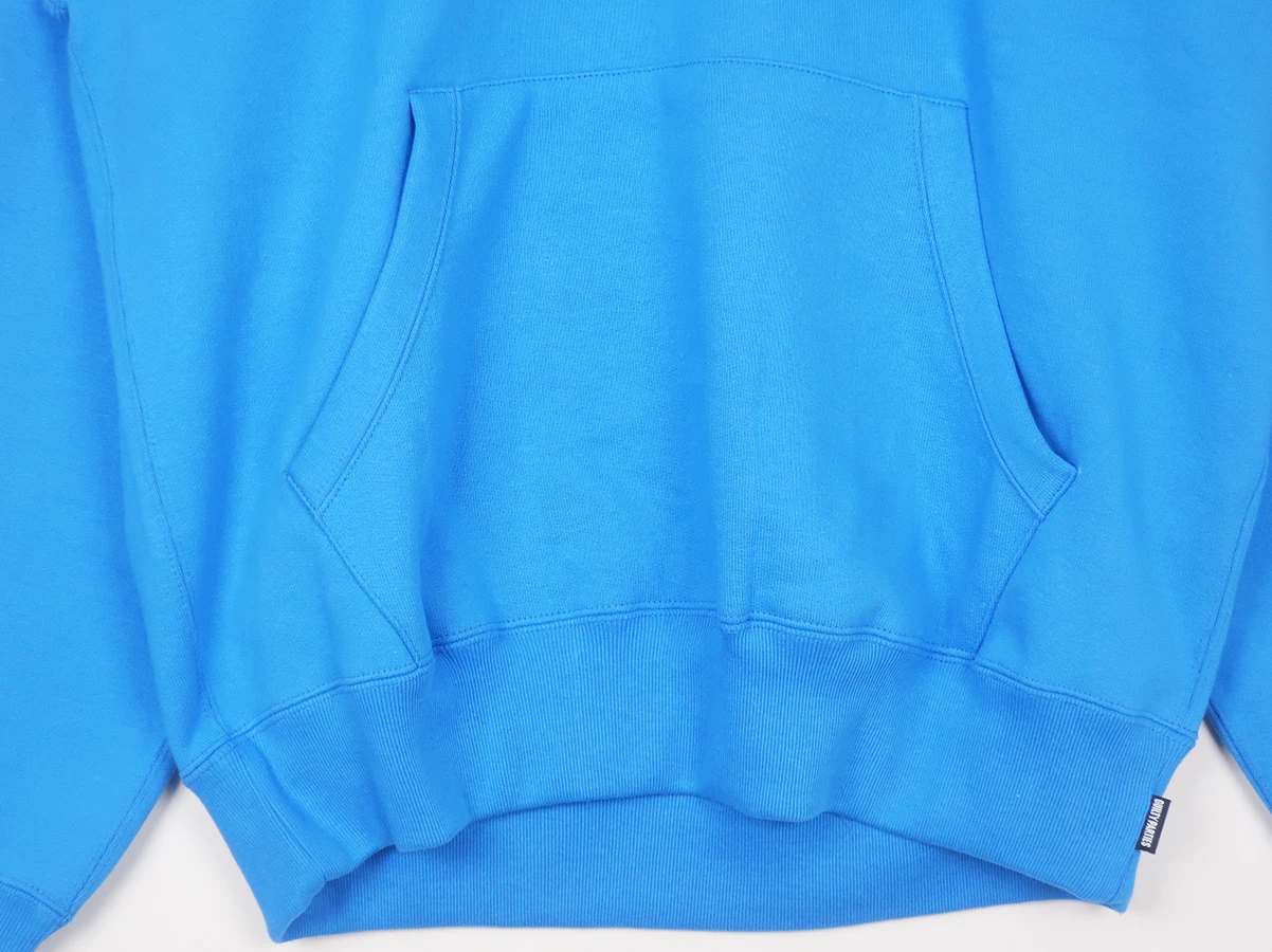 鮮やかなブルーカラーが目を引く、存在感のあるプルオーバーフーディーです。
