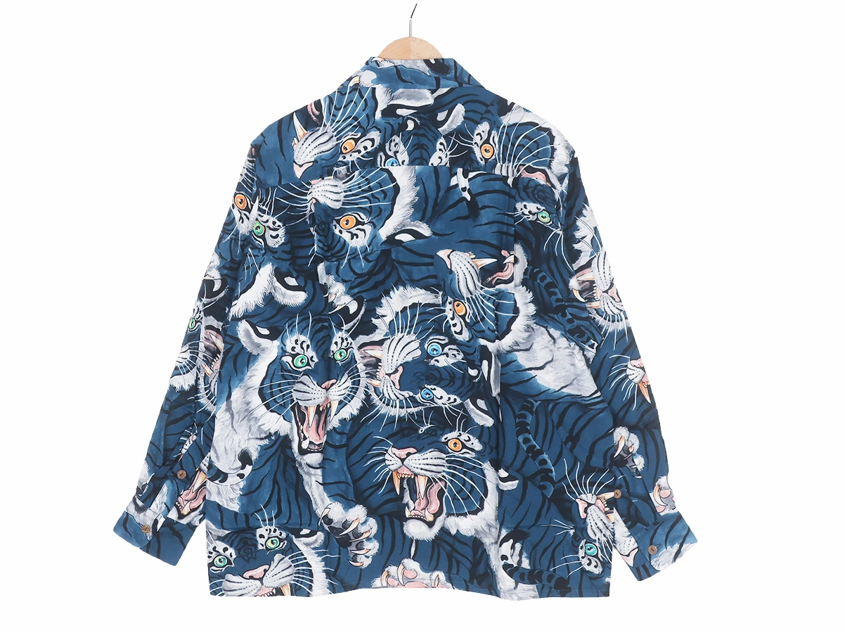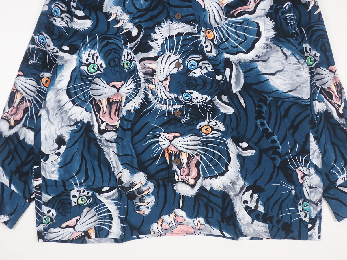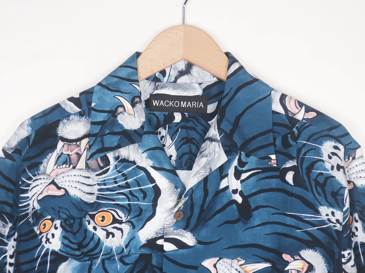 WACKO MARIAを象徴するTIM LEHIによる虎のグラフィックを全面に配したハワイアンシャツ。全面にプリントされた迫力のあるモチーフが特徴的。