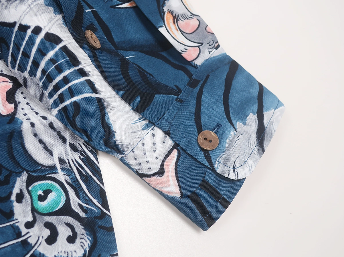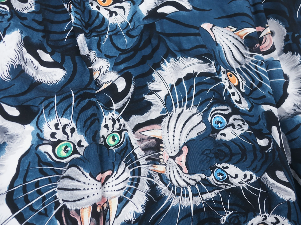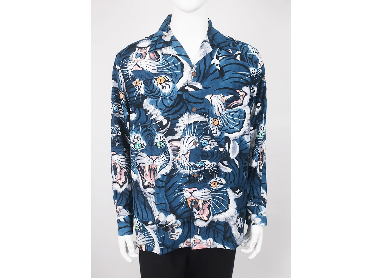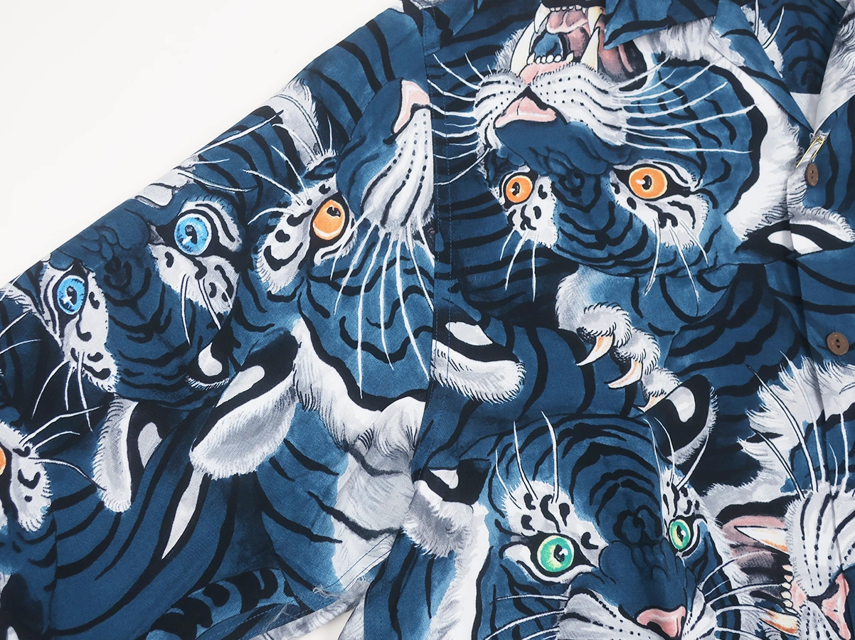 WACKO MARIAを象徴するTIM LEHIによる虎のグラフィックを全面に配したハワイアンシャツ。全面にプリントされた迫力のあるモチーフが特徴的。