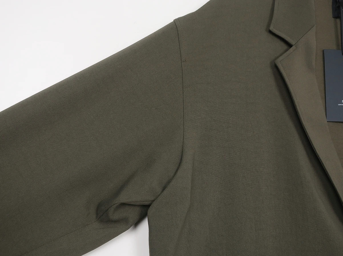 ポリエステルによるシワになりにくい特性とナイロンの耐久性、テンセルがもたらすソフトなタッチが合わさり快適さと機能性を両立。ゆったりとしたシルエットでリラックス感を持たせつつ、テーラードならではの品のある佇まいを表現。