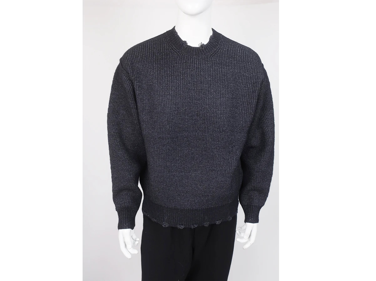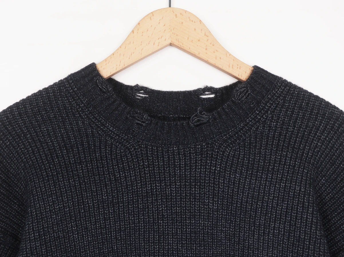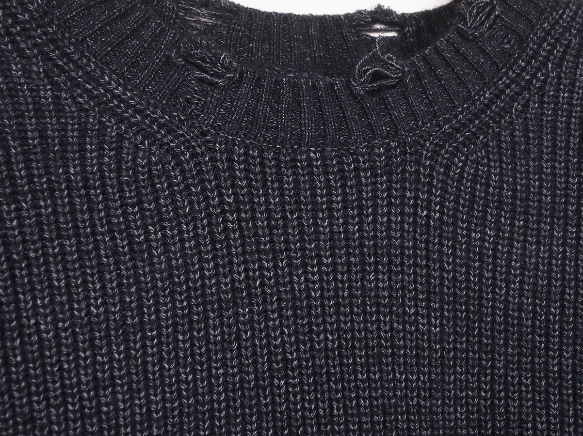 アクリル・ナイロン・ポリエステルをブレンドした糸により、ふっくらとした質感と快適な着心地を実現しています。襟元・袖口・裾のリブ部分にはダメージ加工を施し、着古したようなラフな表情に。シンプルなシルエットながらも、ディテールで個性を感じさせる仕上がりです。