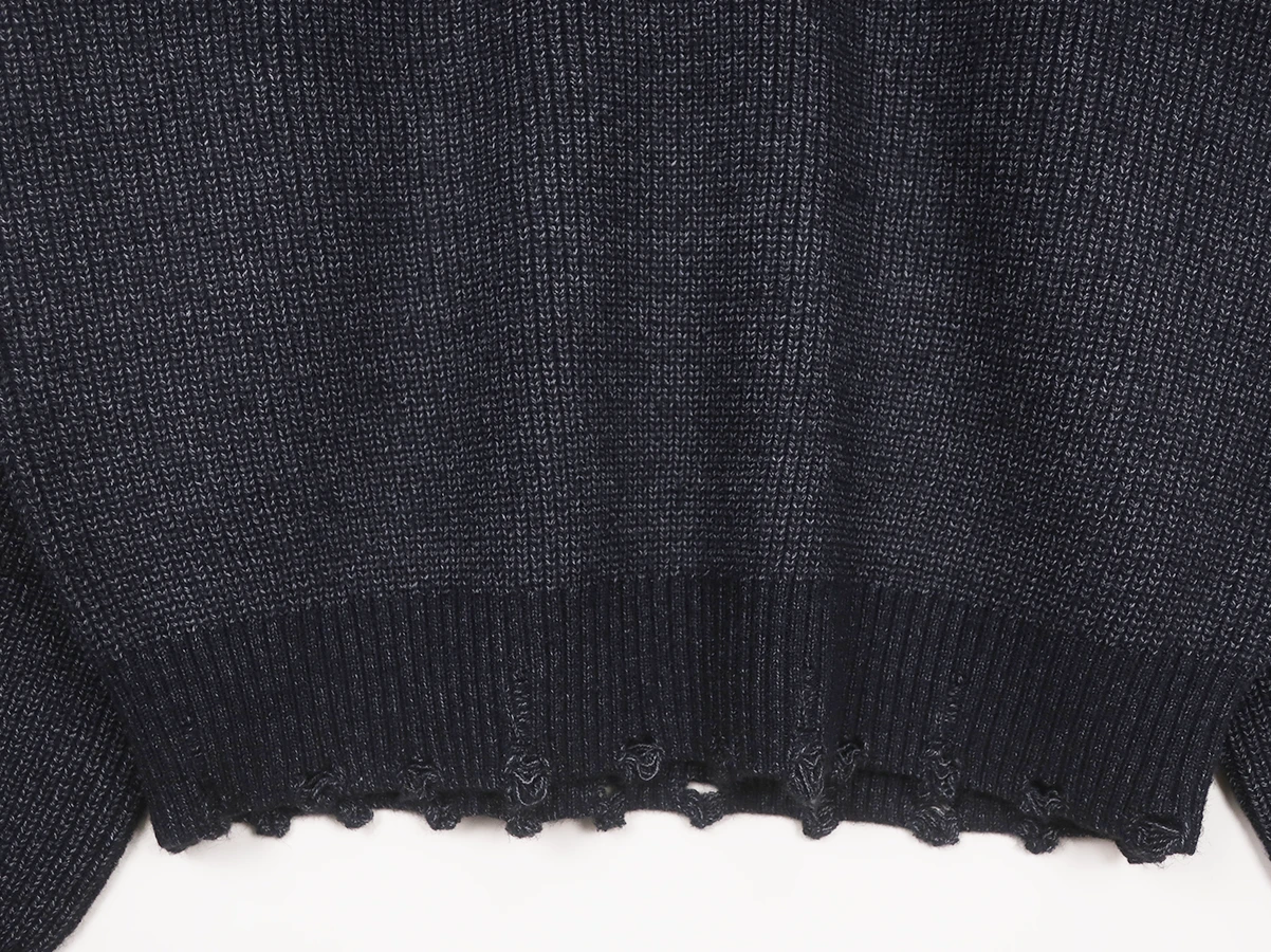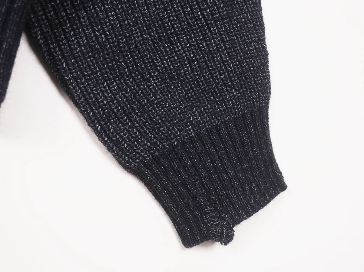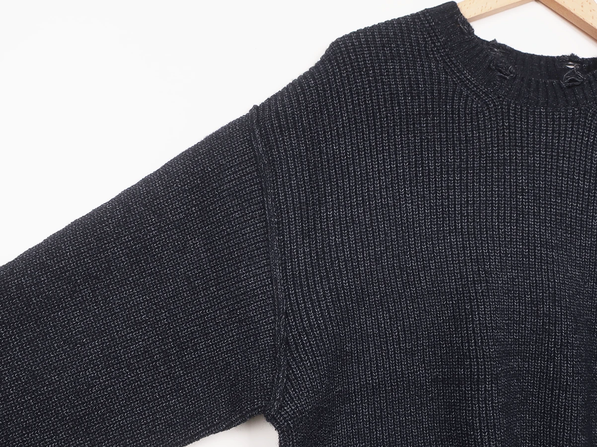 アクリル・ナイロン・ポリエステルをブレンドした糸により、ふっくらとした質感と快適な着心地を実現しています。襟元・袖口・裾のリブ部分にはダメージ加工を施し、着古したようなラフな表情に。シンプルなシルエットながらも、ディテールで個性を感じさせる仕上がりです。