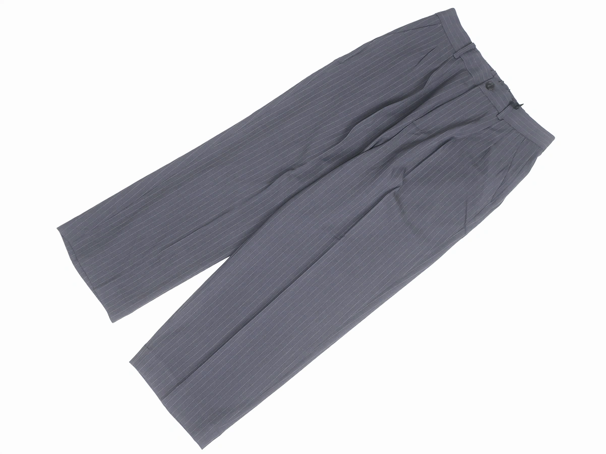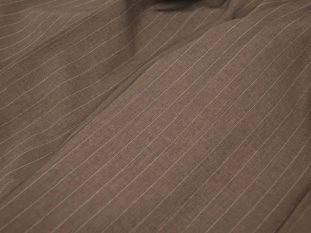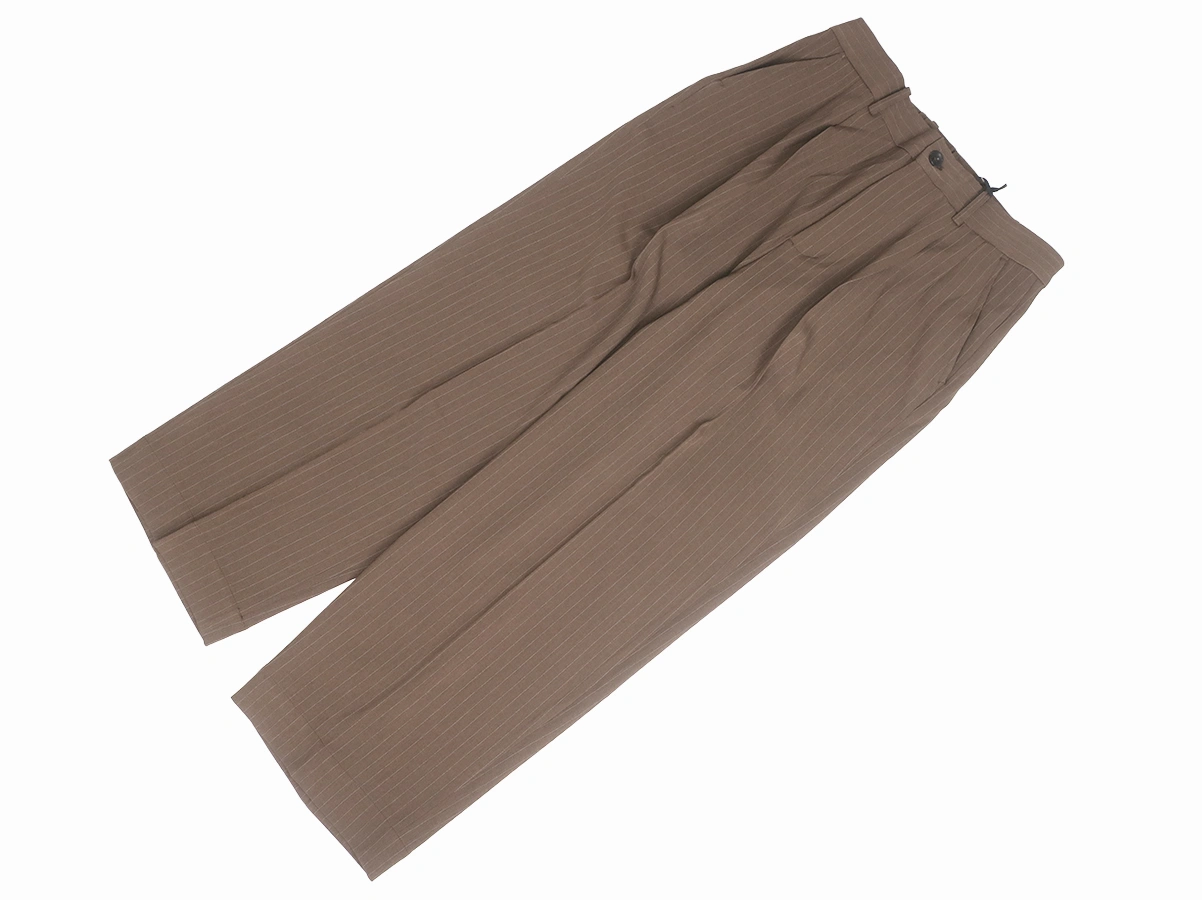 テックツイル素材を使用した、ピンストライプ柄のツータックスラックス。ポリエステル・レーヨン・ポリウレタンの混紡生地は程よいハリと落ち感に加え、ストレッチ性も備えた快適な穿き心地。クラシックなピンストライプに現代的な機能素材を掛け合わせた一本です。