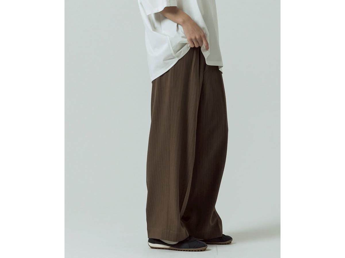 フロントはツータック仕様で、腰回りにゆとりを持たせたシルエット。裾にかけて自然に落ちるワイドストレートラインが上品さとリラックス感を両立します。シャツやジャケットと合わせたきれいめスタイルはもちろん、カットソーやスニーカーと合わせた抜け感のある着こなしにも対応する汎用性の高いスラックス。