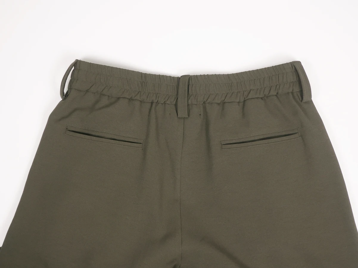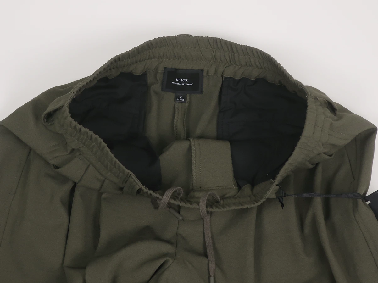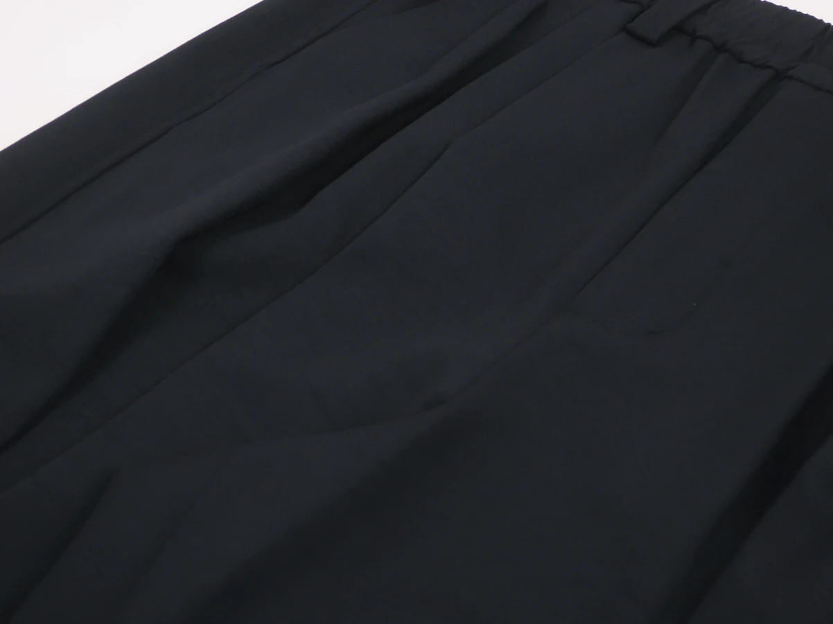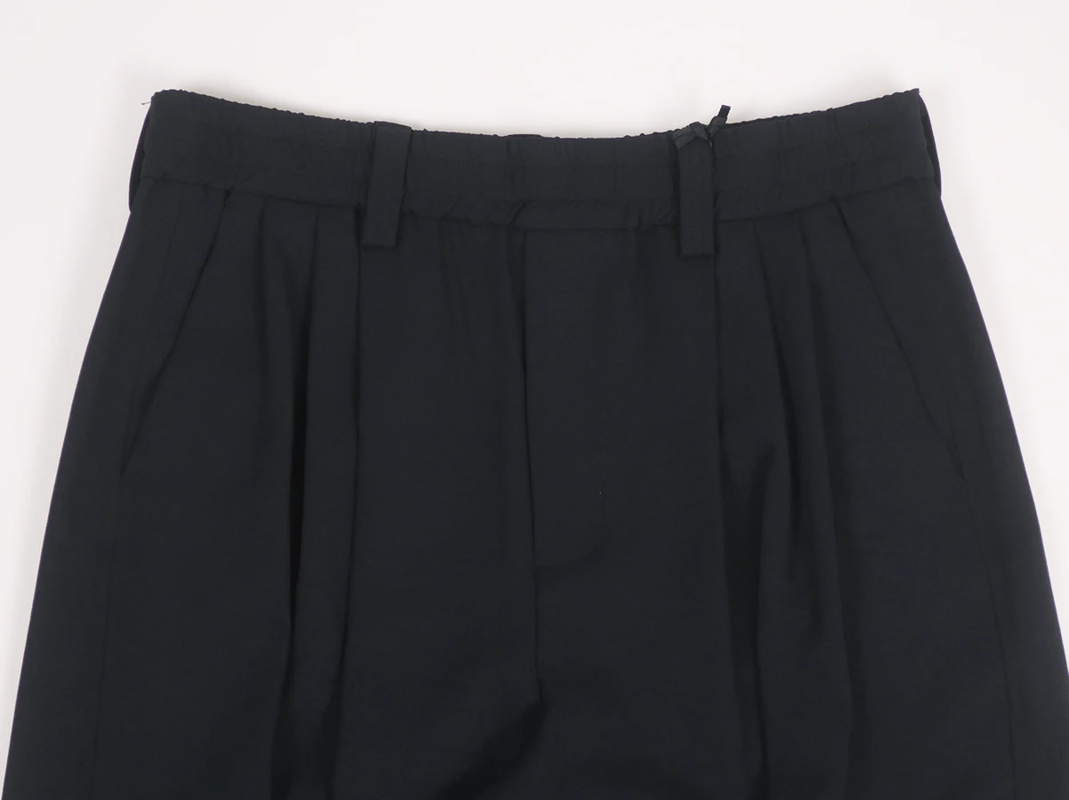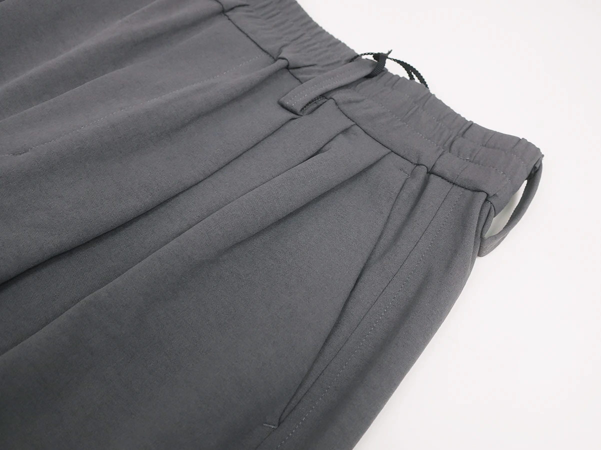 ウエスト部分はベルトループとゴム仕様。フロントに3タック、膝部分に2タックを施すことで生まれる独特なゆったりとしたワイドバルーンシルエットが特徴で、ストレスフリーな着心地を実現。裾裏にはドローコードを配備しており、絞ることでシルエットの変化を楽しめるデザイン。