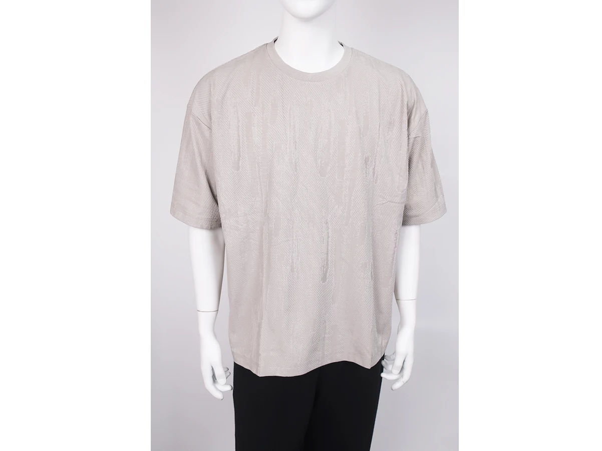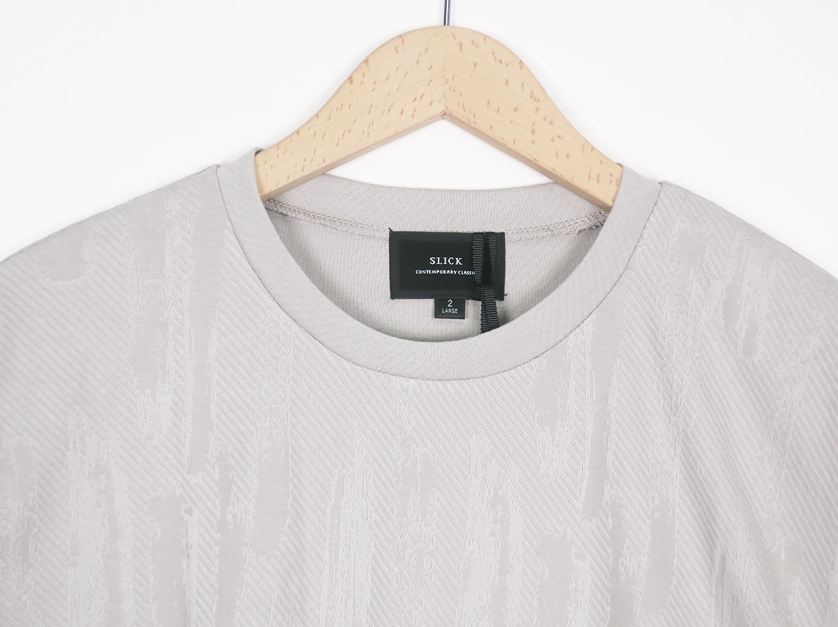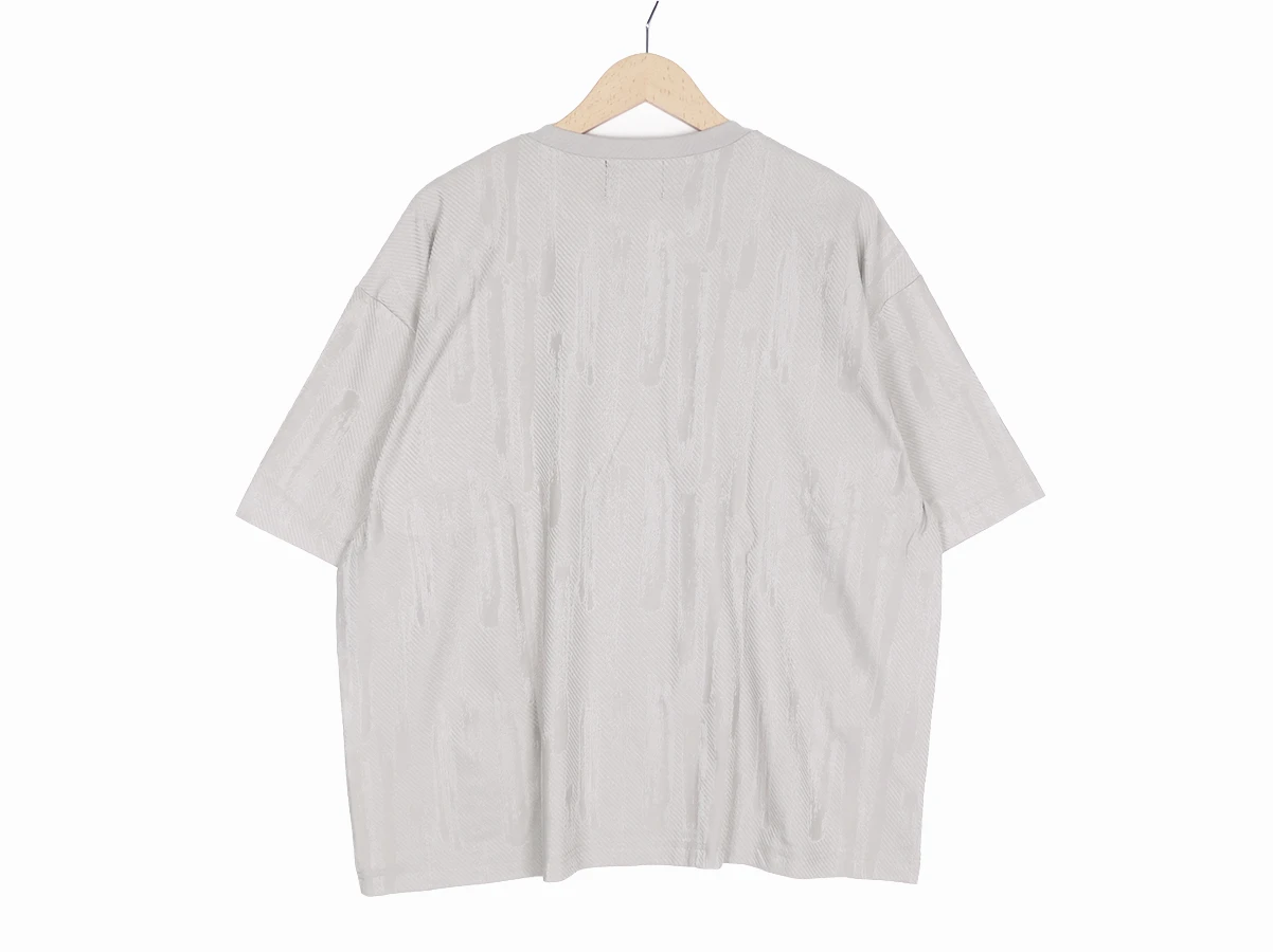 やわらかなトーンの中にしっかりと表情を持たせたSLICKの半袖Tシャツ。抽象柄をジャカードで表現することでプリントにはない奥行きと立体感のある見え方に。