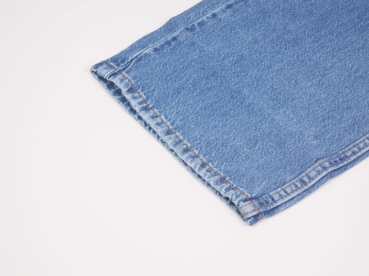 ブルーデニムの5ポケットパンツ。全体に淡い色落ちが見られ、裾までまっすぐ落ちる印象のデザイン。ゆとりがありながらストレートなシルエットで、現代的でゆったりとしたフィット感を実現。