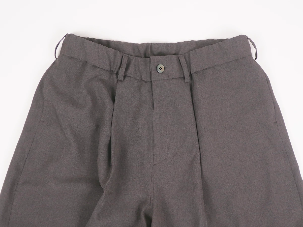 ドライタッチな麻調の擬麻(ギマ)を使用したリネンライクな素材感が特徴です。ポリエステルなので乾きやすく、またシワにもなりにくいため、リネンに比べて圧倒的に扱い易いのが魅力です。
