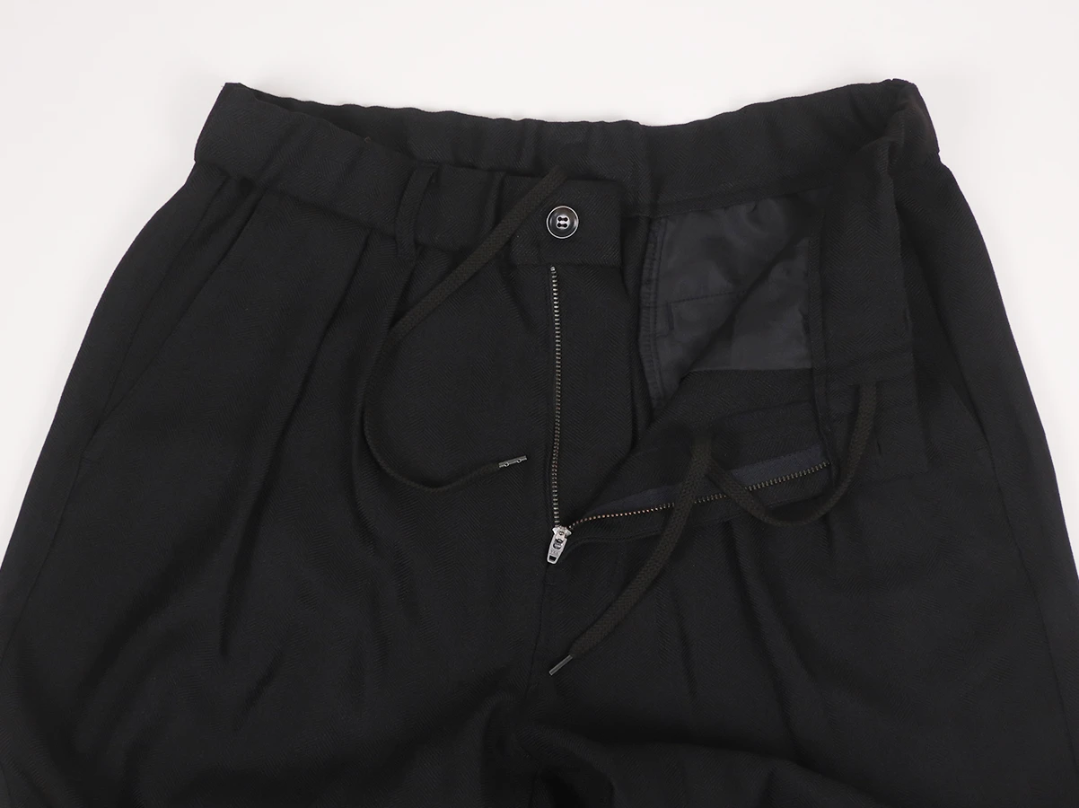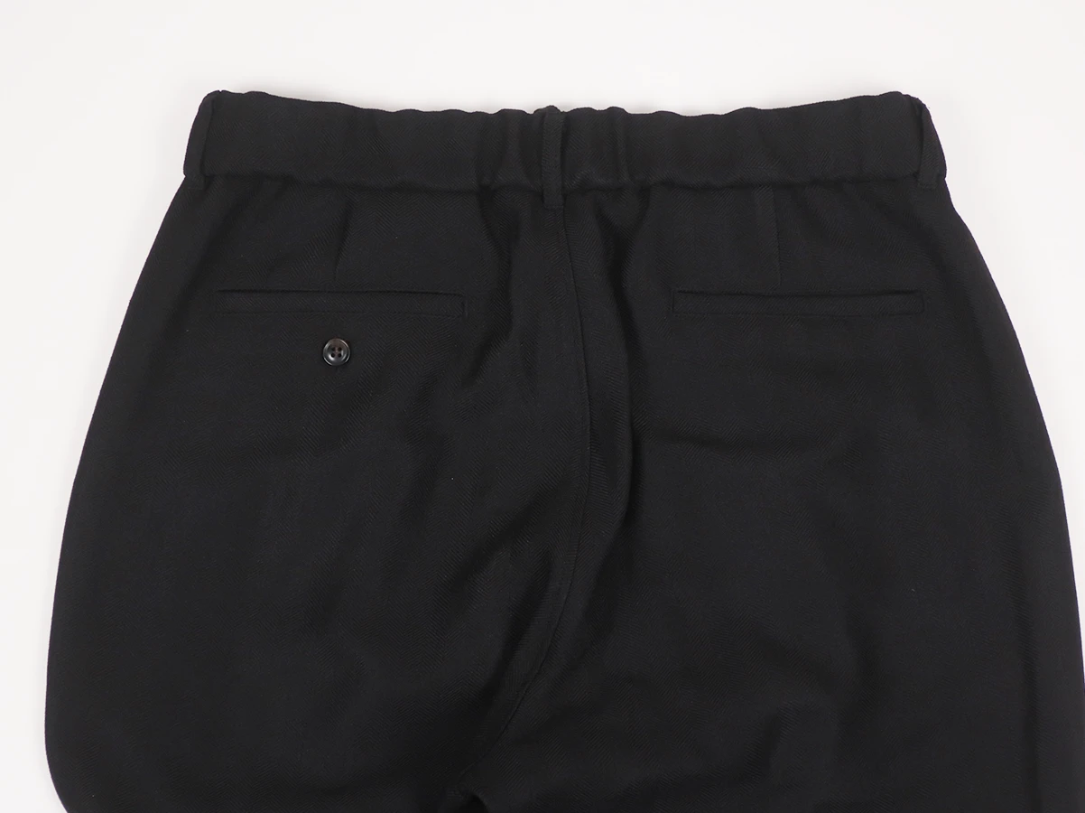 ウエスト箇所にはゴムを縫い込みドローコードを配したイージーパンツ仕様。通年で活躍出来るアイテムです。ベルトループも備えておりますのでワンサイズ上をギュッと締めての着用もお勧めです。