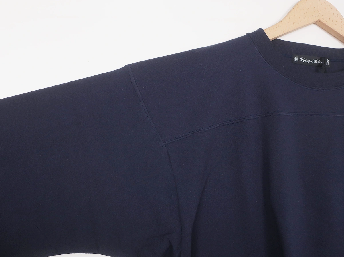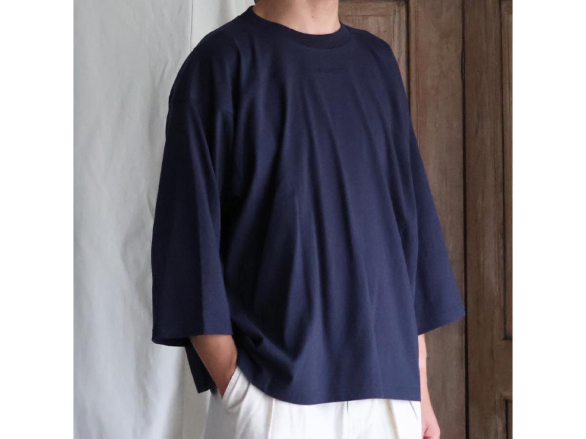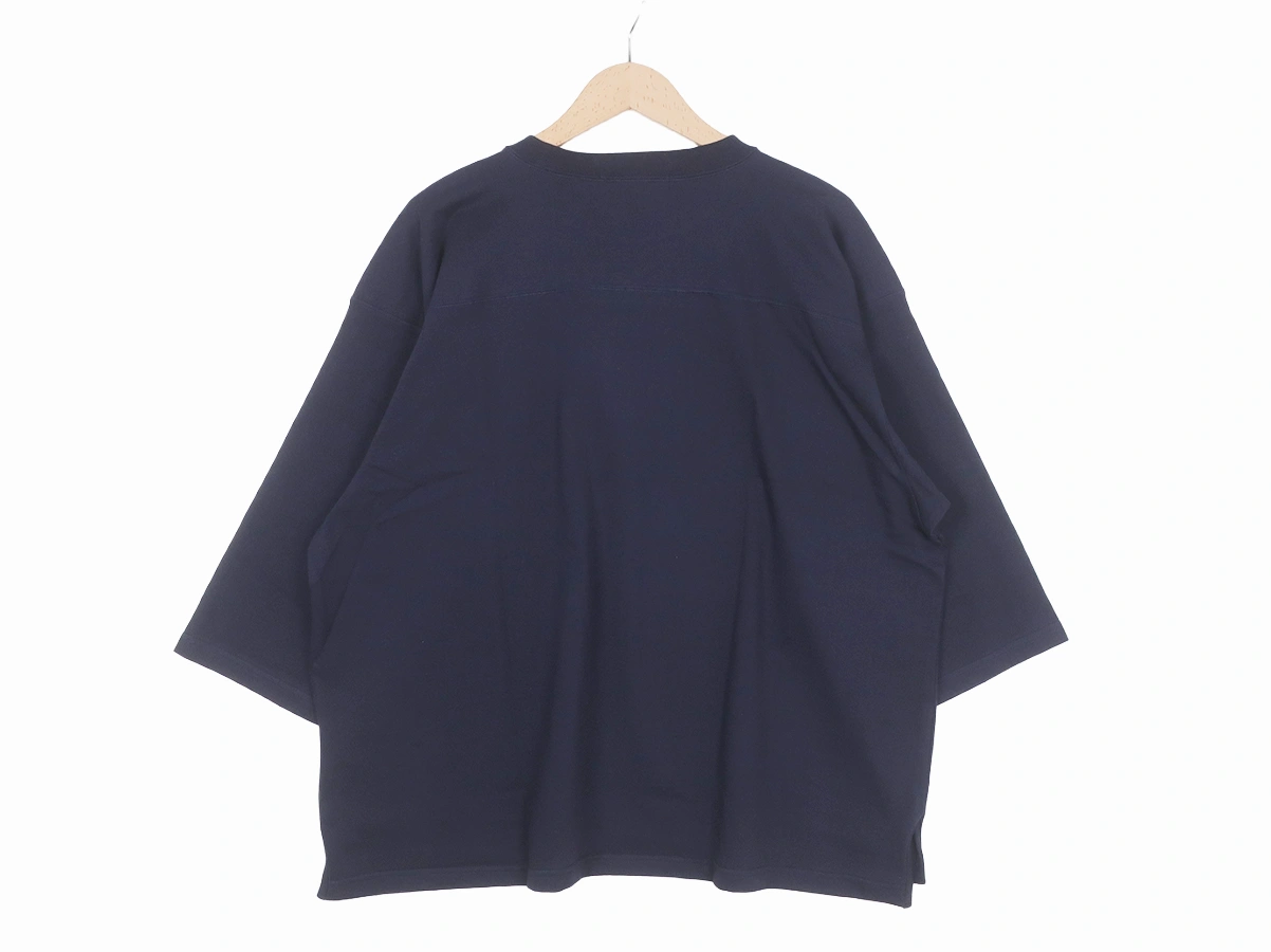 フットボールシャツのような胸の切り替えラインが特徴の7分袖Tシャツです。肩が程よく落ちるボックスシルエットでバランスの良いシルエットが魅力。
