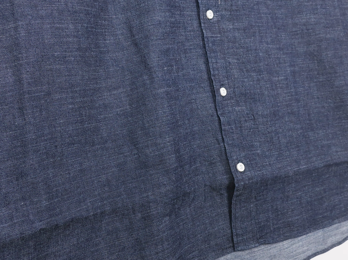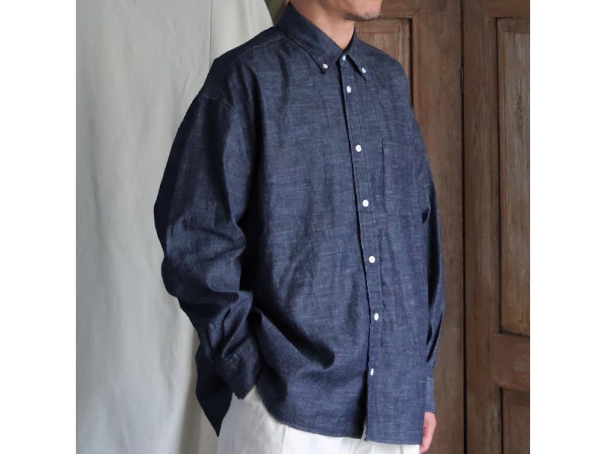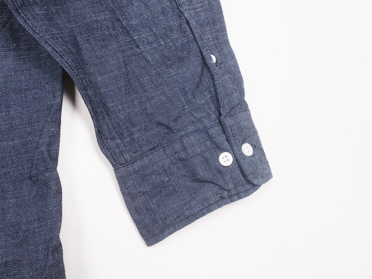 軽やかでこれからの季節にピッタリ。一年中活躍してくれるデニムシャツです。備中備後(びっちゅうびんご)と呼ばれる、デニムの産地、広島県 福山市の機屋で織られた生地です。旧式の力織機(シャトル機)でゆっくりと丁寧に織り上げられた、6ozセルヴィッチデニム。力織機で織られた生地は薄くてもコシがあり、洗いを繰り返すと立体感のある生地の表情が出ます。