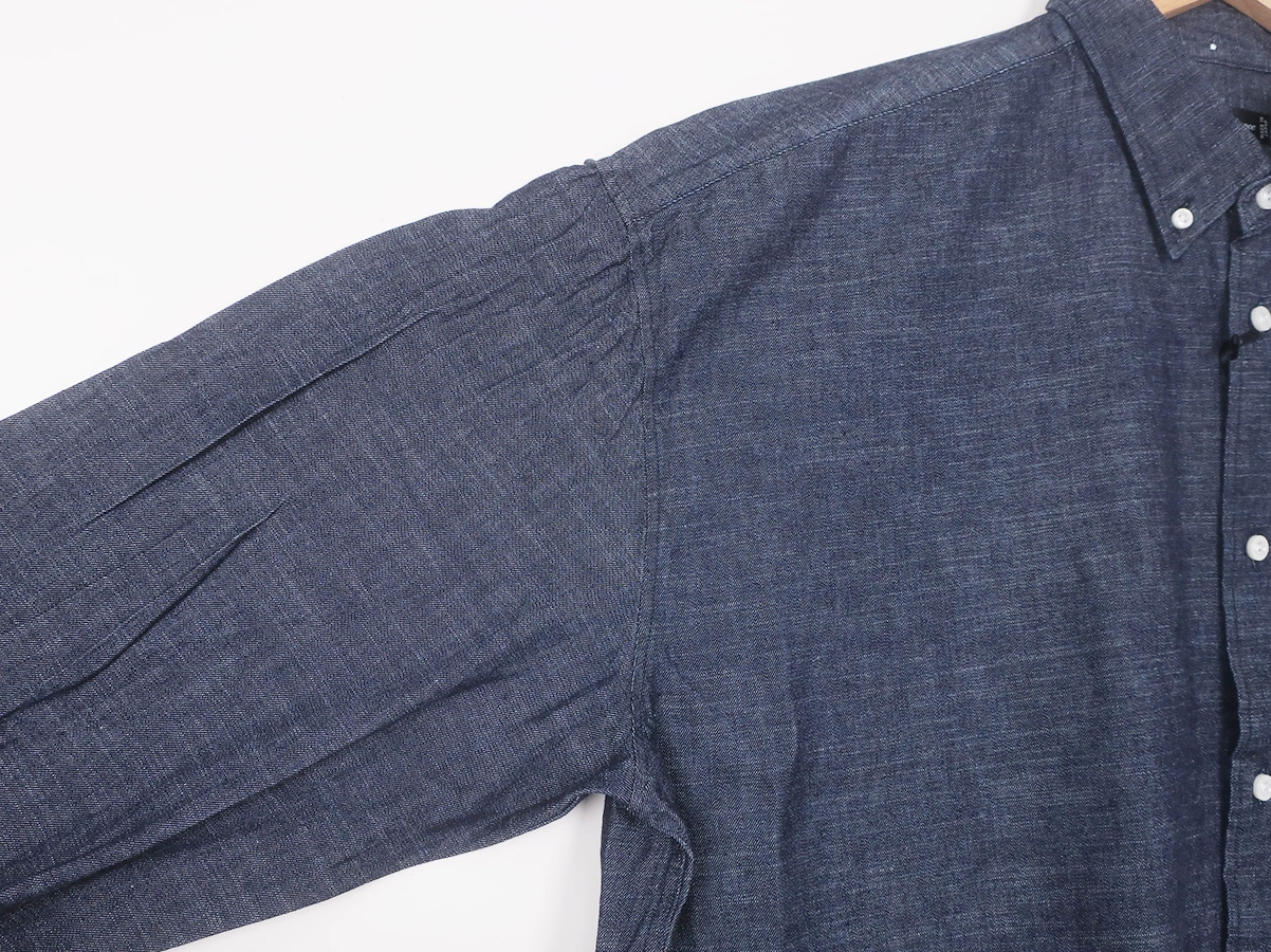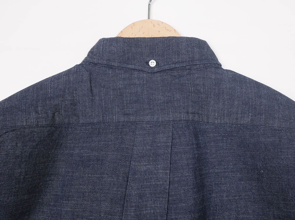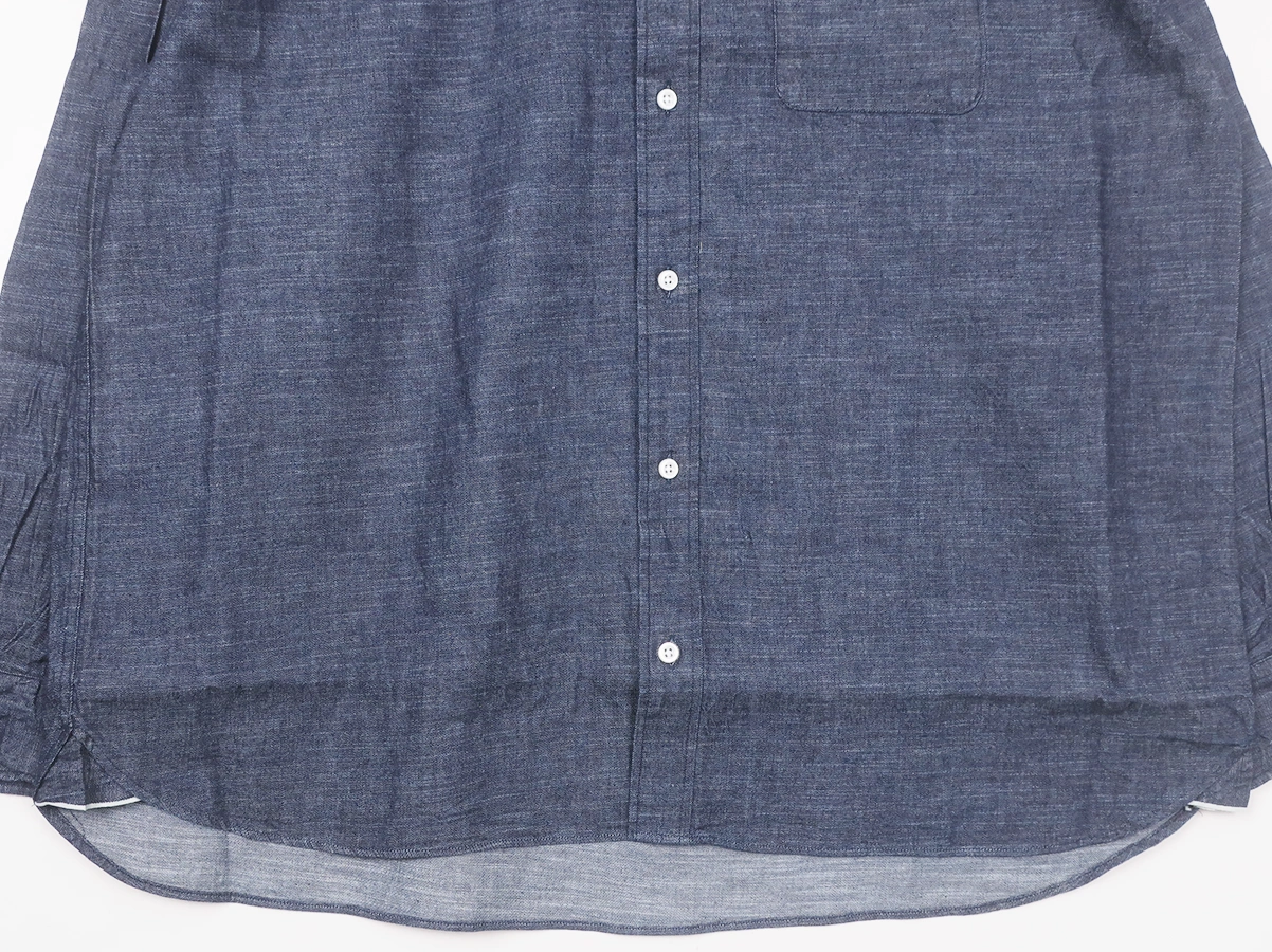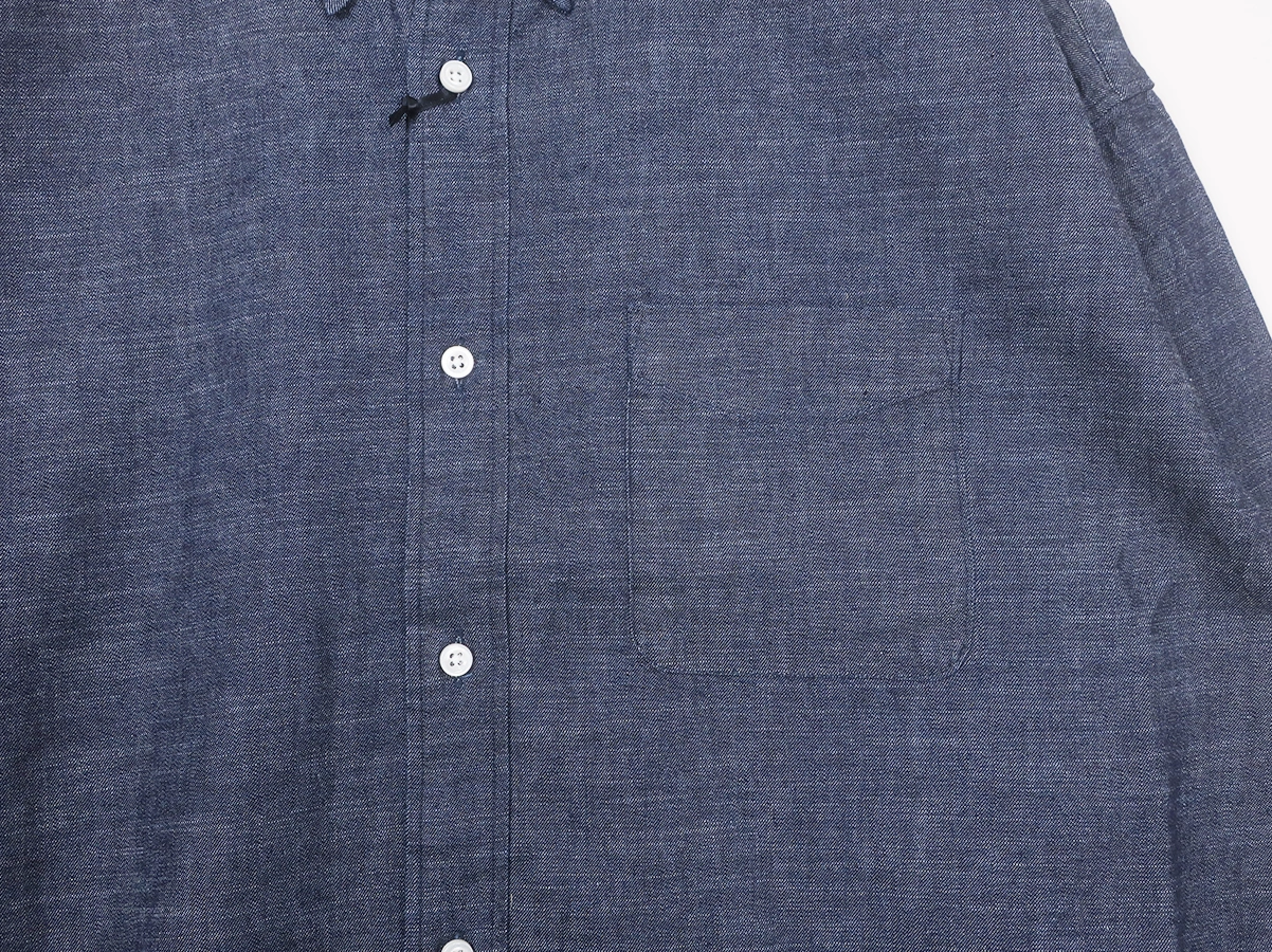 軽やかでこれからの季節にピッタリ。一年中活躍してくれるデニムシャツです。備中備後(びっちゅうびんご)と呼ばれる、デニムの産地、広島県 福山市の機屋で織られた生地です。旧式の力織機(シャトル機)でゆっくりと丁寧に織り上げられた、6ozセルヴィッチデニム。力織機で織られた生地は薄くてもコシがあり、洗いを繰り返すと立体感のある生地の表情が出ます。