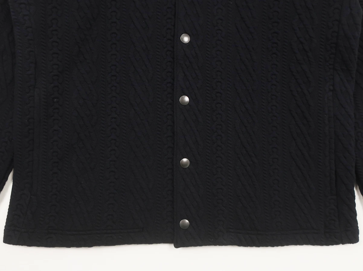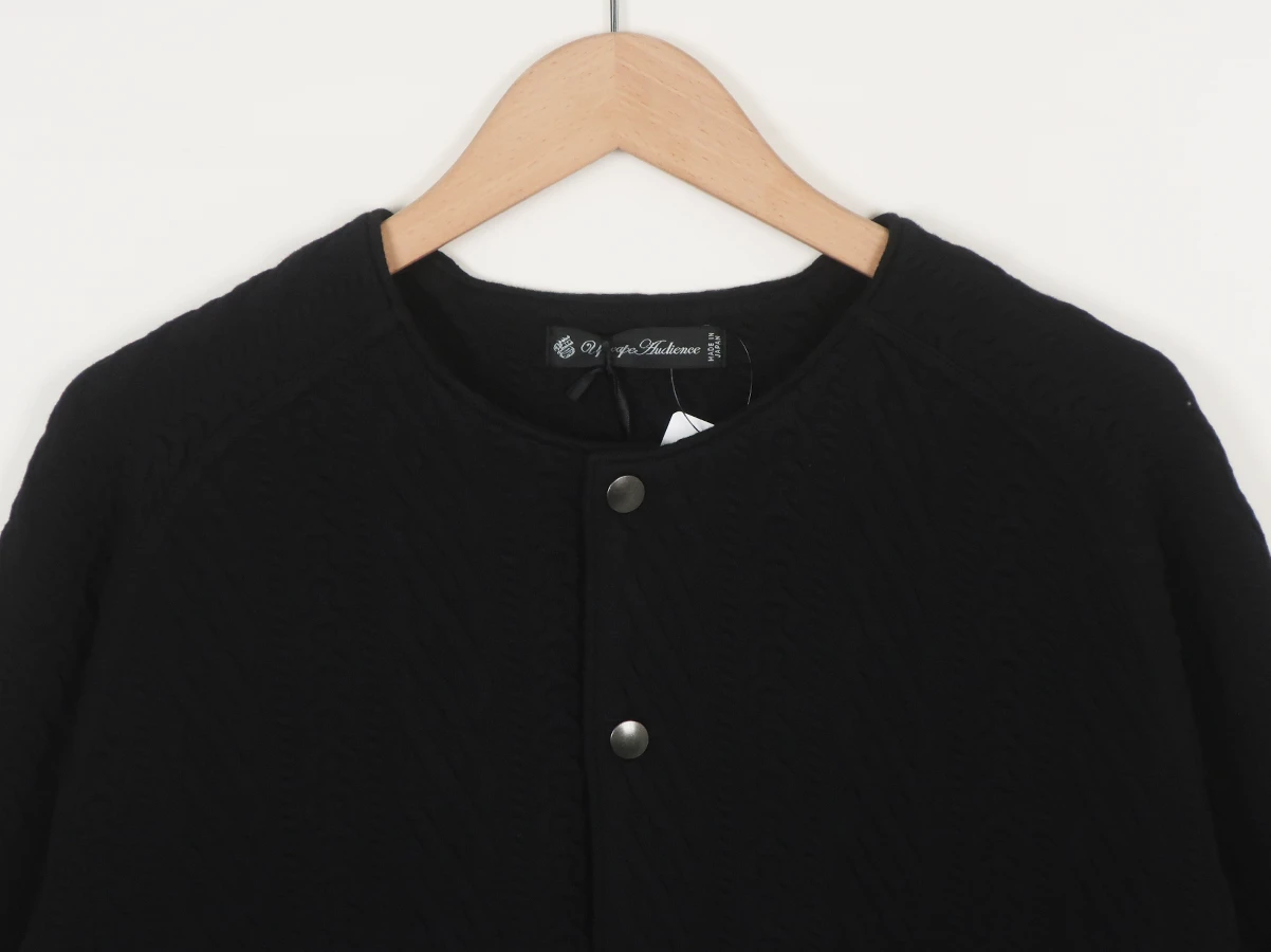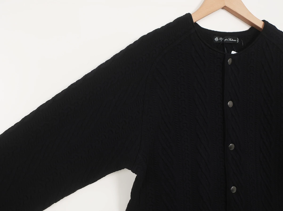 コットンキルトシリーズのノーカラースナップジャケット。袖口にリブを配しております。