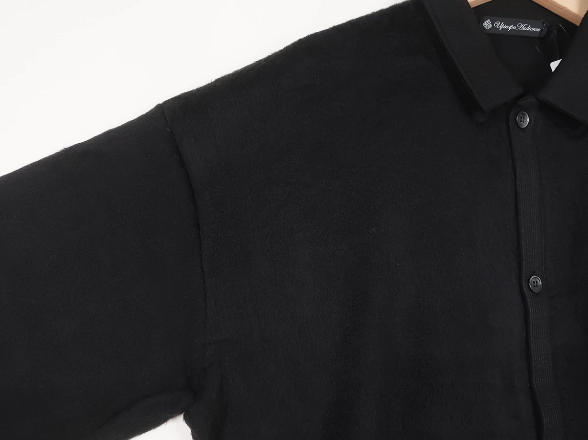 インナーにモックネックを入れたスタイリングや、カーディガンとしてブルゾンやコートのインナーとしてもおすすめ。モヘアカーディガンのような感覚で着ていただけるニットソーです。毛足の長い表情感は寒い時期のニット素材として最適。