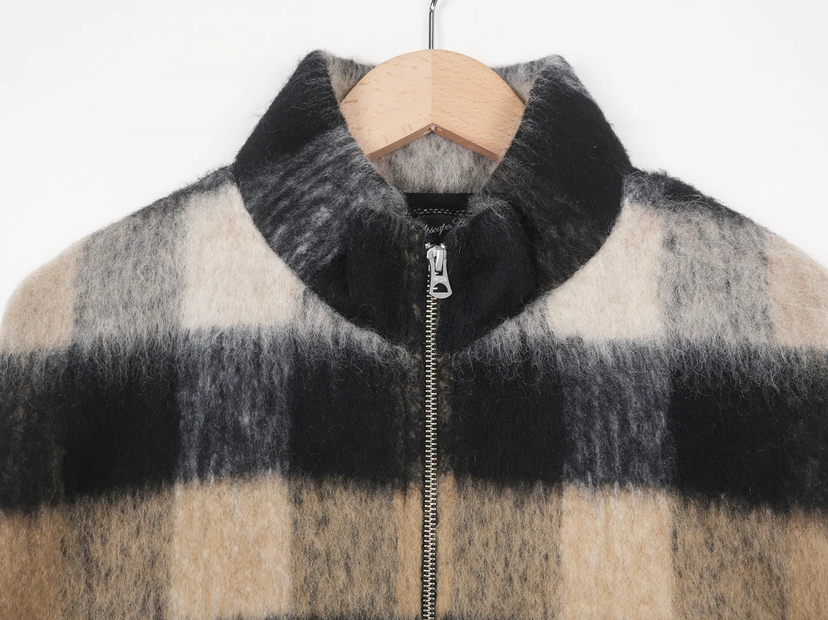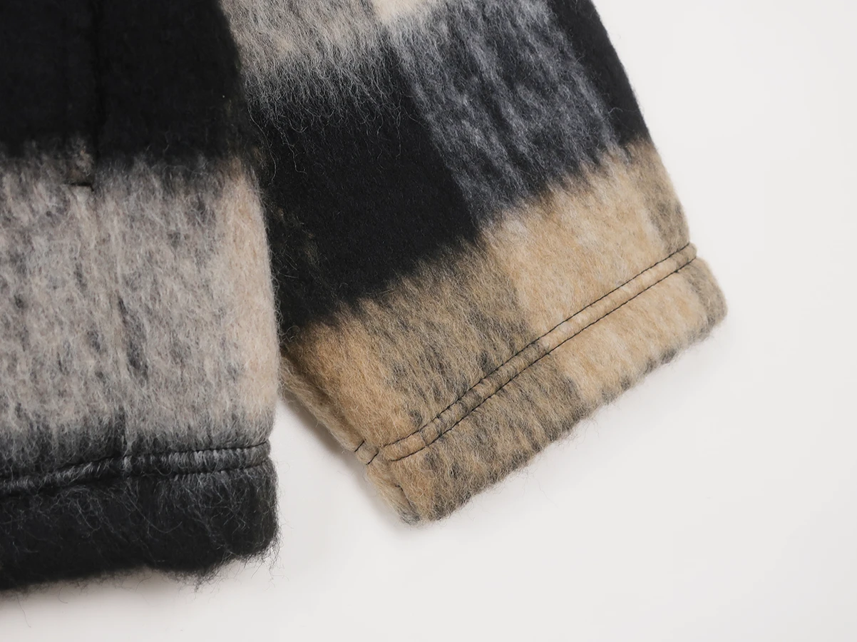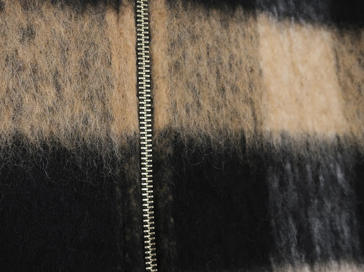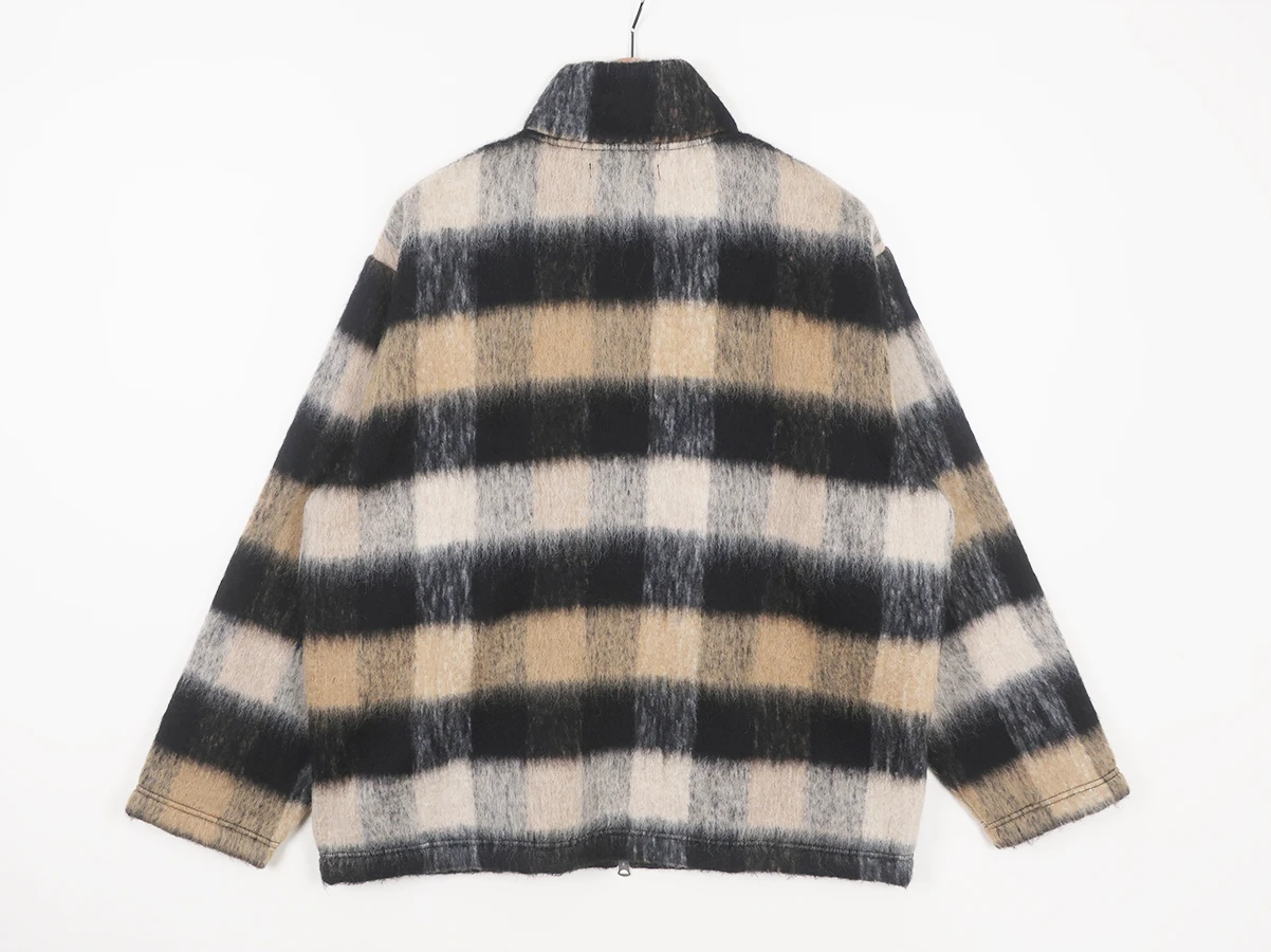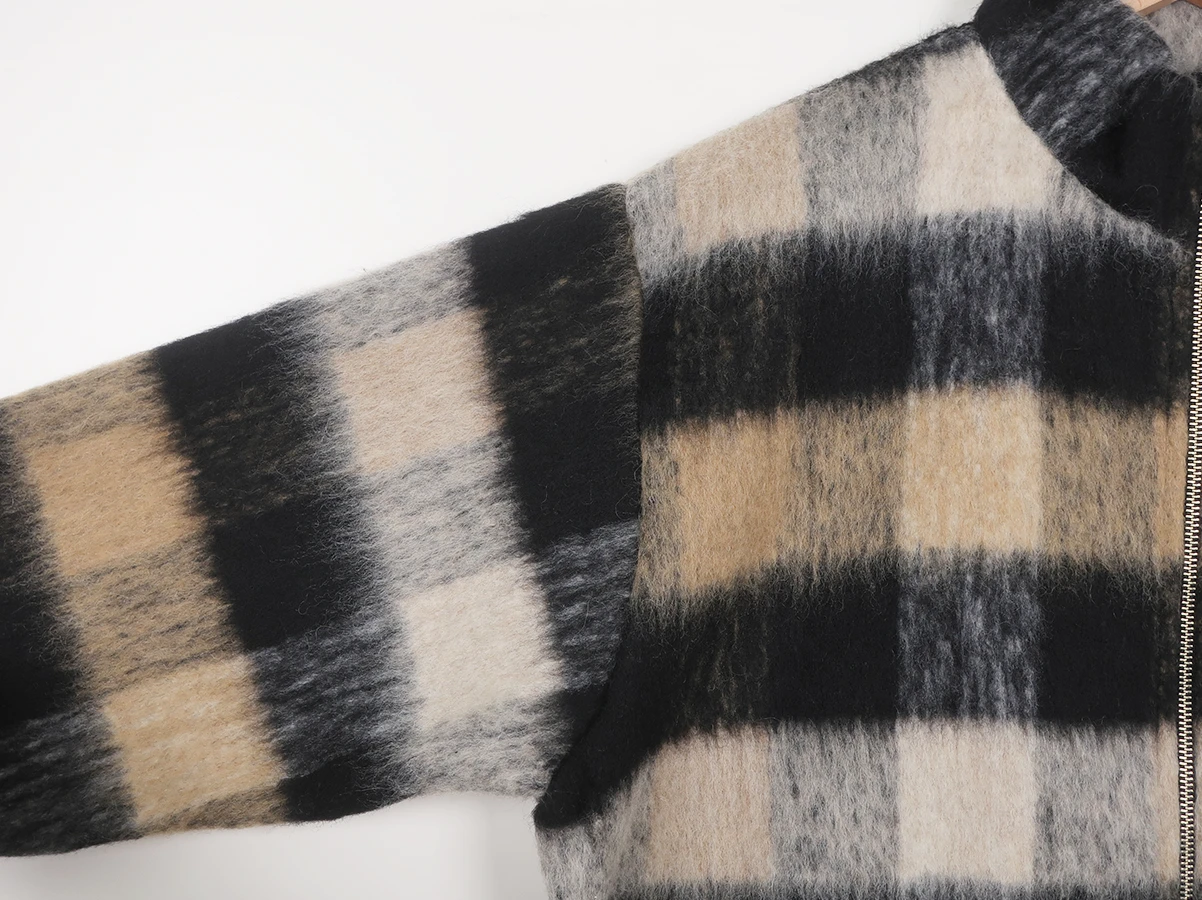 ふんわりとした柔らかなシャギーチェック柄はどこか懐かしさを感じさせながらもモダンな印象。軽量で保温性にも優れており、肌寒い季節の羽織りとして活躍。
