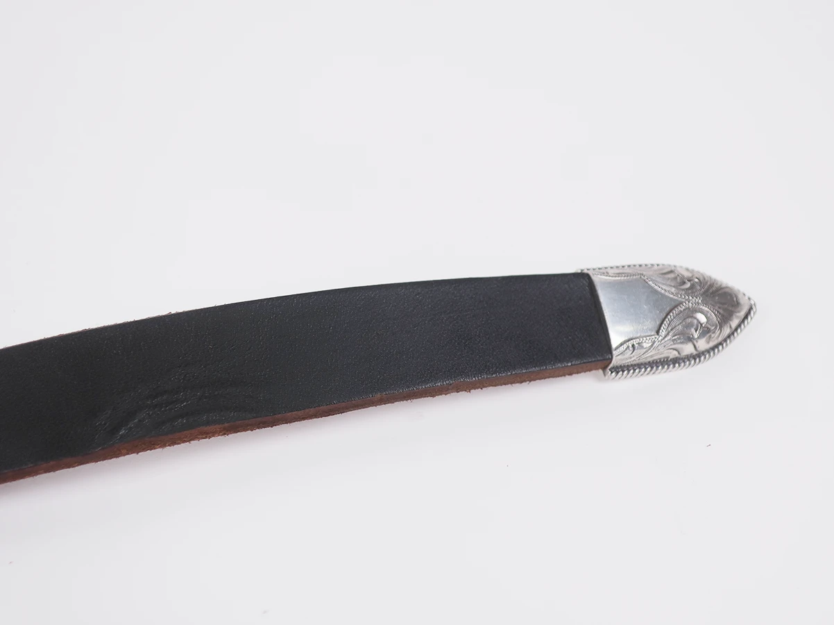 バックル、ベルトループ、剣先に装飾金具を取り付けた雰囲気ある1本。