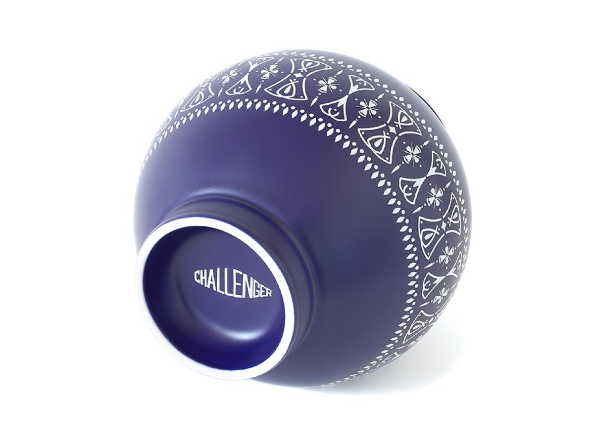 ネイビーブルーの陶器にホワイトの模様を施したCHALLENGERオリジナルのフラワーベース。