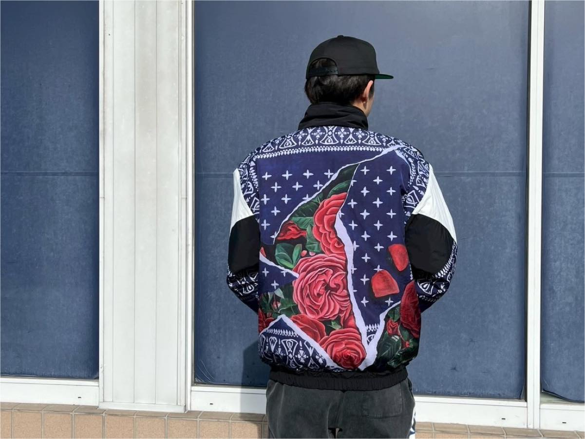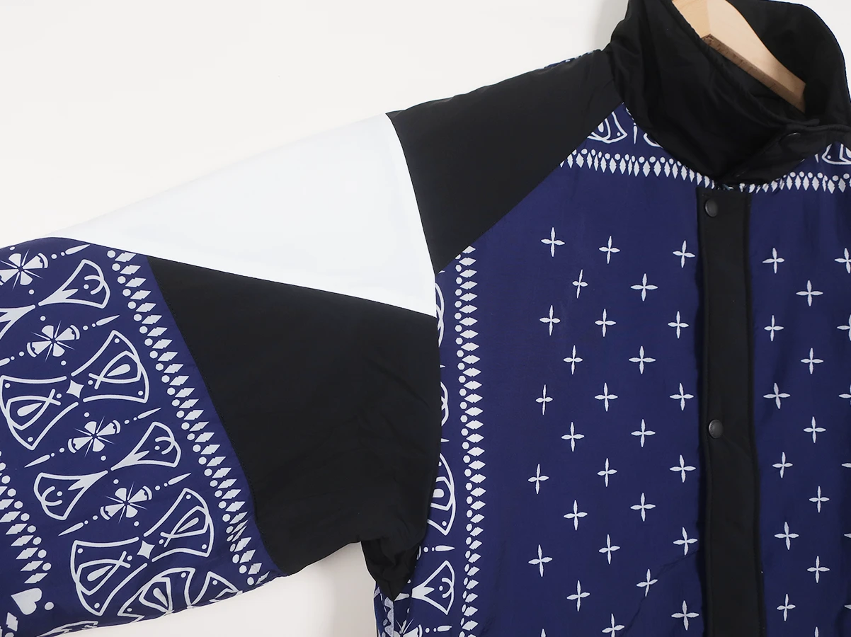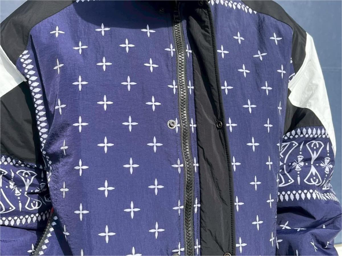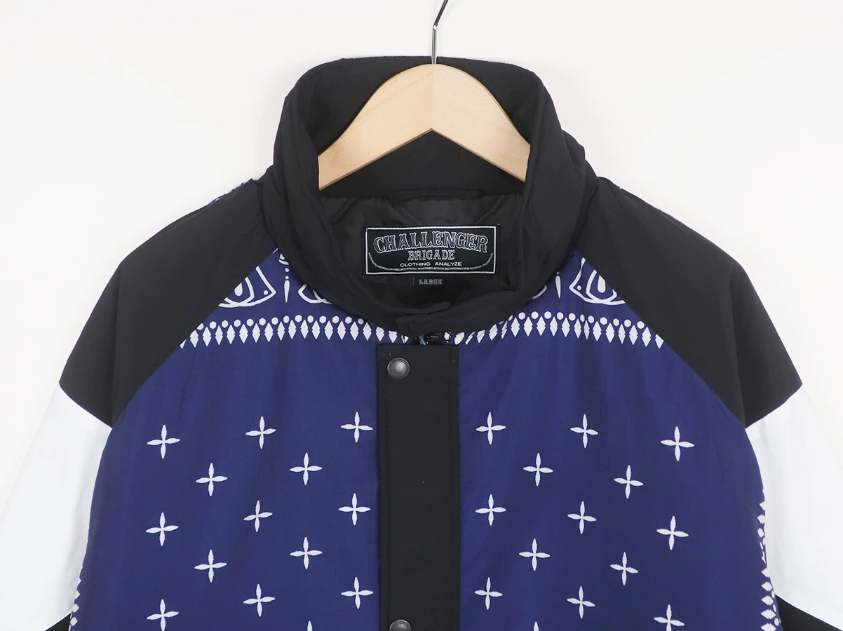 80年代のスポーツジャケットを思わせるシルエットとバンダナ柄を大胆に組み合わせたCHALLENGERらしい一着。身頃から袖にかけて切り替えを入れ、バイカラーとバンダナパターンをミックスした印象的なデザインが特徴です。