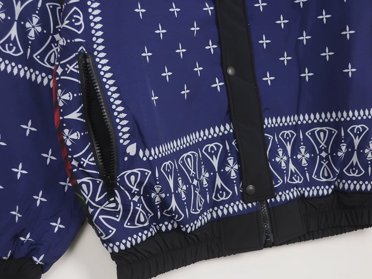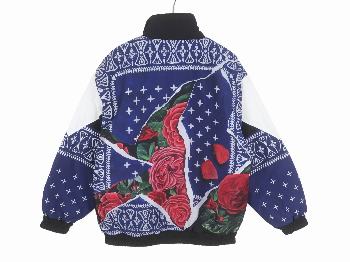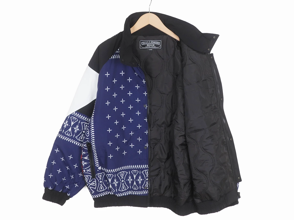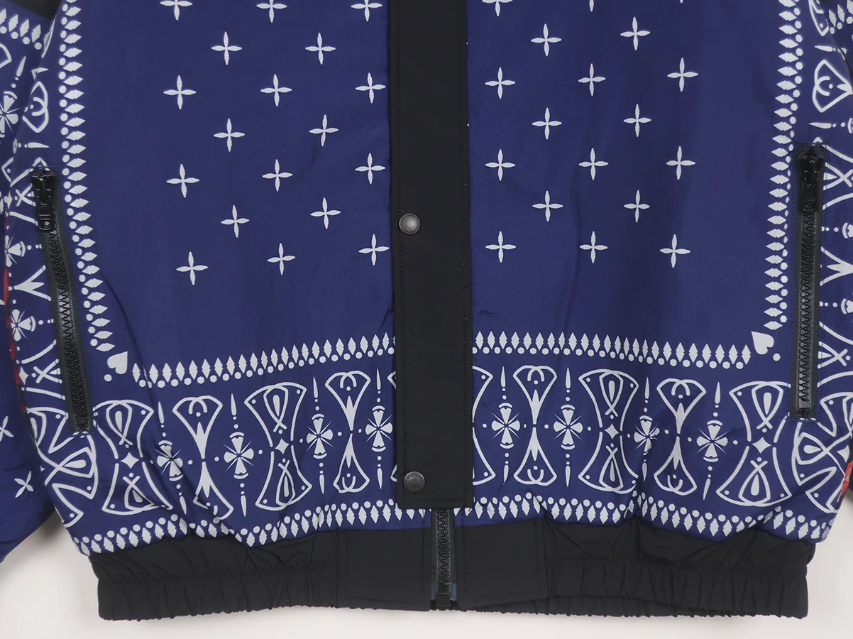 80年代のスポーツジャケットを思わせるシルエットとバンダナ柄を大胆に組み合わせたCHALLENGERらしい一着。身頃から袖にかけて切り替えを入れ、バイカラーとバンダナパターンをミックスした印象的なデザインが特徴です。
