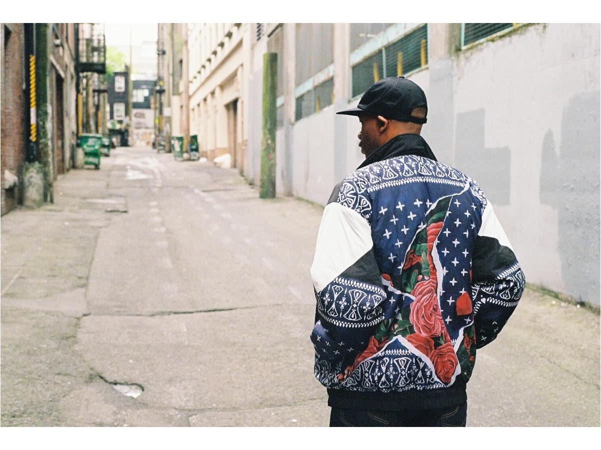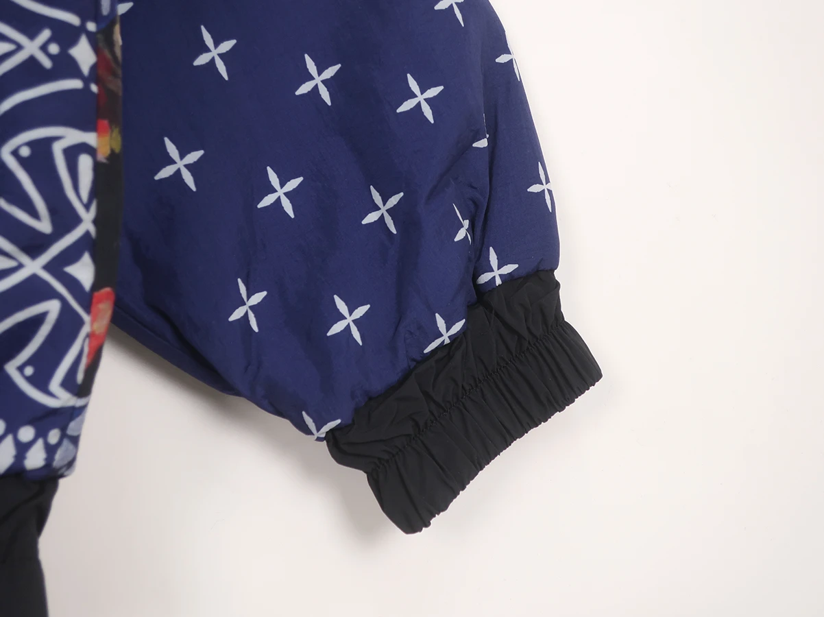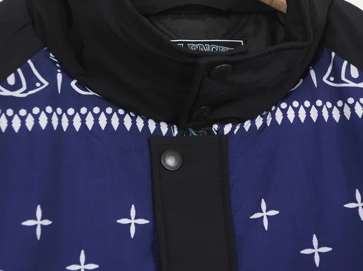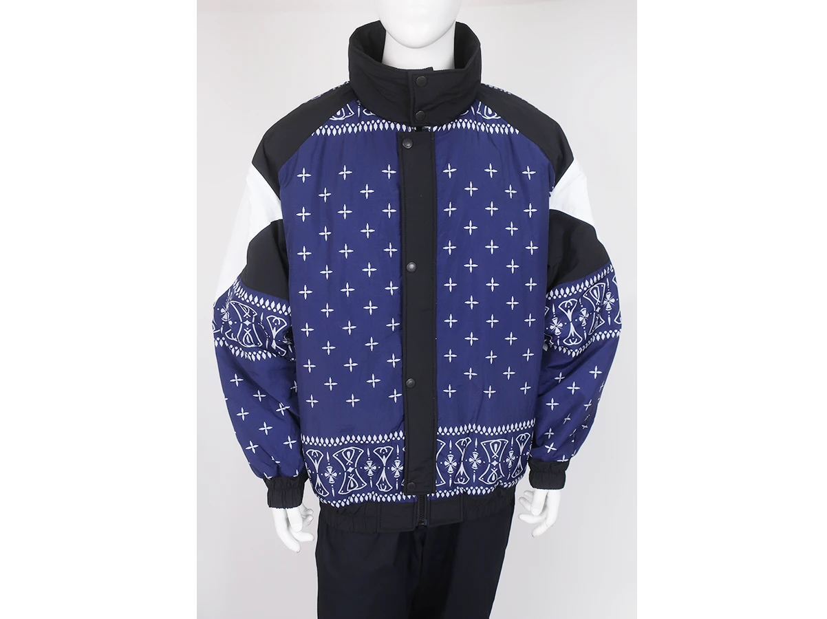 80年代のスポーツジャケットを思わせるシルエットとバンダナ柄を大胆に組み合わせたCHALLENGERらしい一着。身頃から袖にかけて切り替えを入れ、バイカラーとバンダナパターンをミックスした印象的なデザインが特徴です。