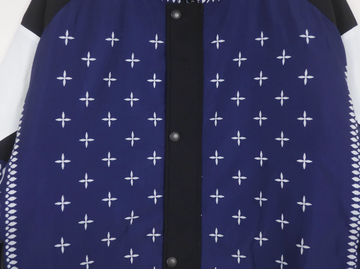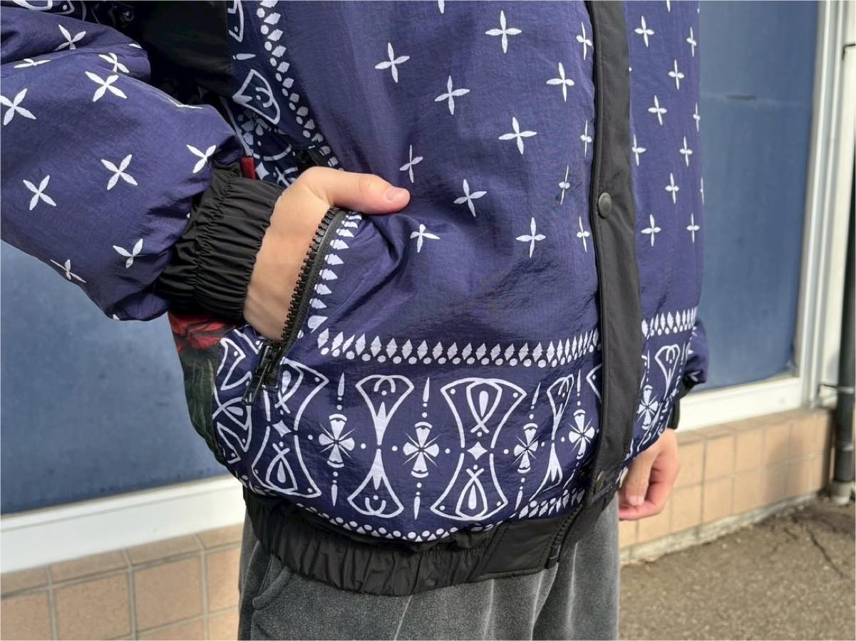 フロントはスナップボタンとジップの二重構造で、着脱しやすく実用性も確保。裾と袖口にはリブを配し、全体を程よく引き締めています。中綿入りで保温性があり、冬場のメインアウターとしても活躍する仕上がり。全体の柄使いがシンプルなパンツやフーディとの相性も抜群です。