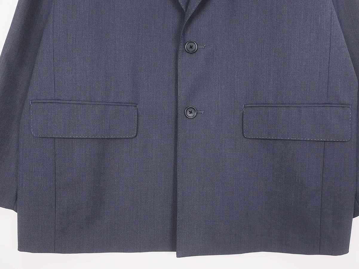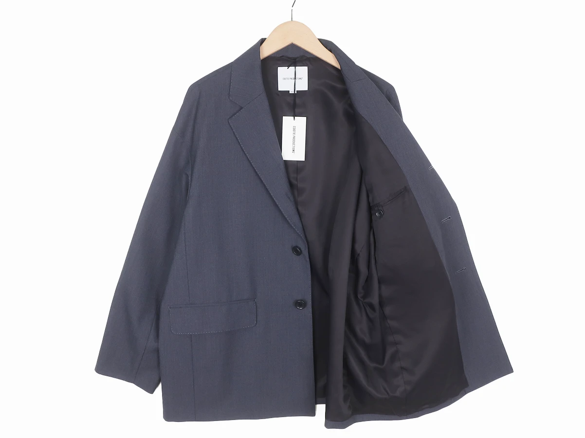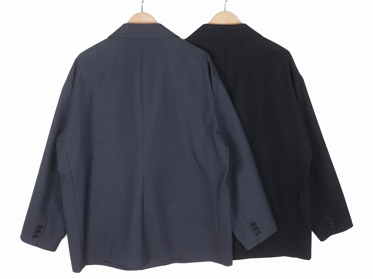 ウールとポリエステルの混紡糸を高密度に織り上げた T/Wサキソニー生地 を使用したシングルジャケット。